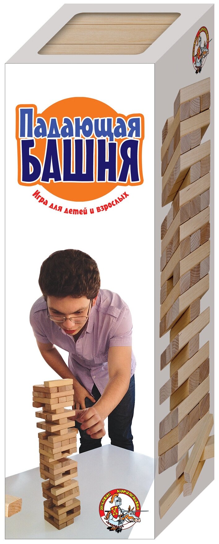 «Падающая башня» — это увлекательная настольная игра, аналогичная известной во всем мире игре Jenga. Она подходит как для веселой компании, так и проведения досуга в семейном кругу.Основная задача игры: построить из деревянных брусочков башню в 18 рядов и поочередно перекладывать палочки с нижних ярусов наверх, усложняя следующему игроку задачу. Чем выше башня, тем неустойчивее бруски, сложнее игра и веселее атмосфера. Проигрывает тот, по чьей вине конструкция рушится, а значит — время реванша!«Падающая башня» - не просто игра, это поле битвы, в котором развивается командный дух (а почему бы не разделиться на две команды?), терпение, логика и усидчивость!