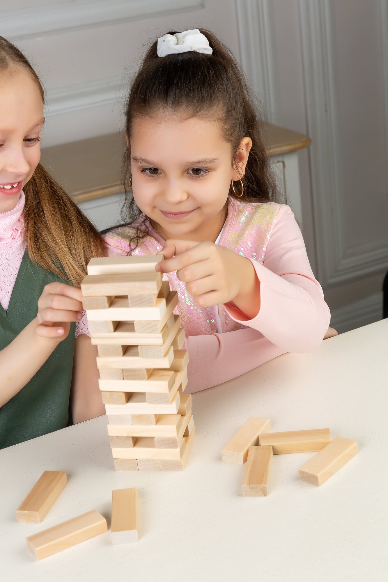 Играли всей семьёй))) 5,7,и 27 лет) было очень весело!!! У нас появилась новая любимая игра для всех которая не скоро надоест) однозначно рекомендую! Брусочки все одинаковые, отшлифованные. В комплекте идёт "уголок" для выравнивания уже сложенном башни. В описании написано, что она может вырасти в два раза! Но это точно не у новичков)))