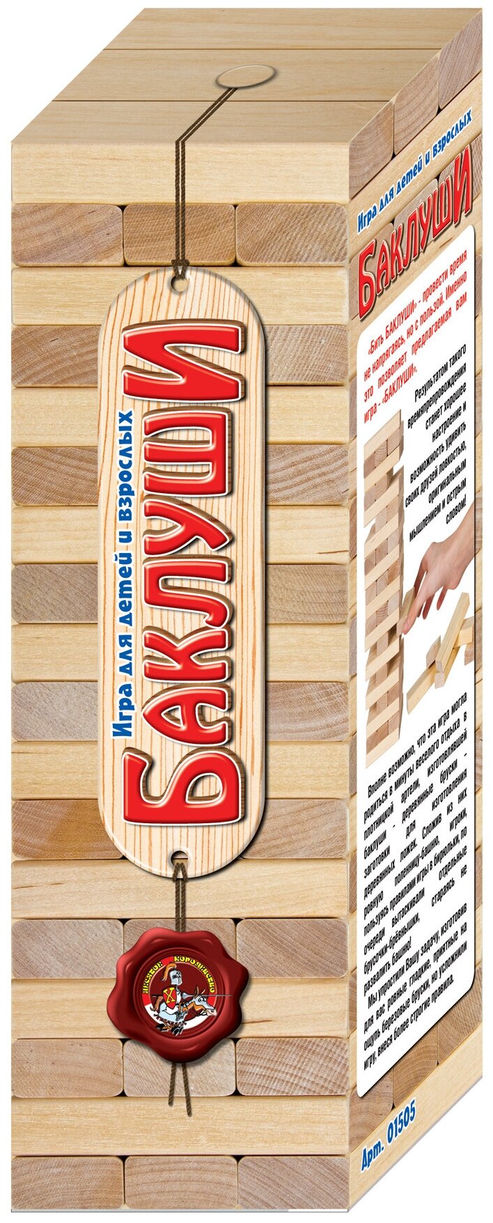Баклуши это деревянные бруски – заготовки, которые используют при изготовлении деревянных ложек. Многие часто употребляют выражение «бить баклуши» означает, провести время не напрягаясь, но с пользой, например, развлечься игрой. Эта игра отлично подойдет для семейного вечера или для того, чтобы померяться ловкостью у компании друзей. Для начала игры на столе особенным образом выстраивается 18-ти этажная башня, задача игроков вынимать по баклуше из башни и класть ее на верхний ряд.