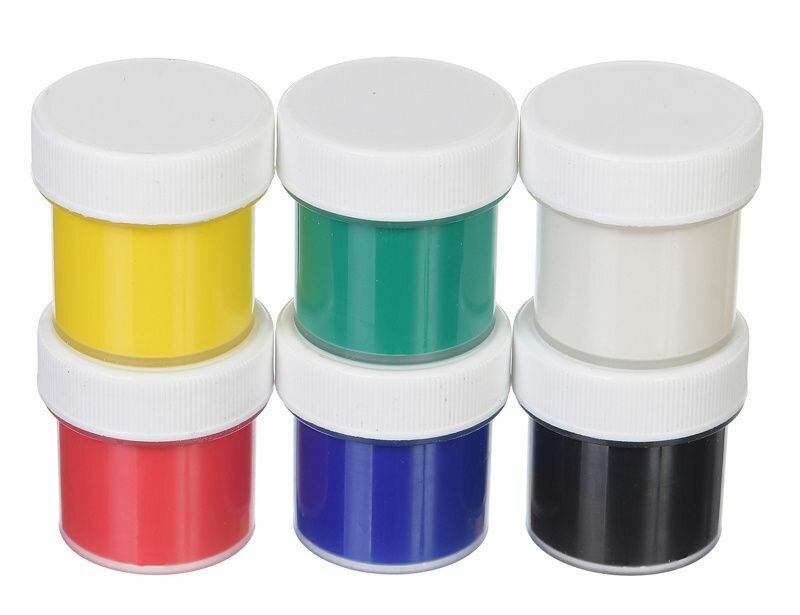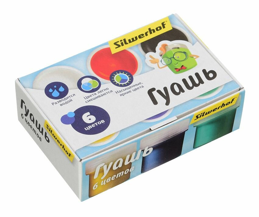 Гуашь. 6 цветов по 10 мл. Яркие цвета, гуашь разводится водой, цвета легко смешиваются. Упаковка: картонная коробка.