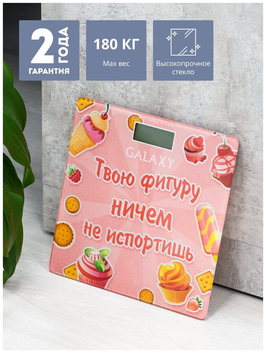 Купила в подарок сестре, она оценила)) Забавный дизайн со всякими вкусняшками) Максимальный вес 180 кг, есть индикация перегрузки, чтобы предупредить, что надо есть меньше))) Огромный плюс весов, что есть прорезиненные ножки для устойчивости и предотвращения скольжения, автоматическое отключение и плюс бонус элемент питания CR2032 1 штучка. Спасибо за быструю доставку!)