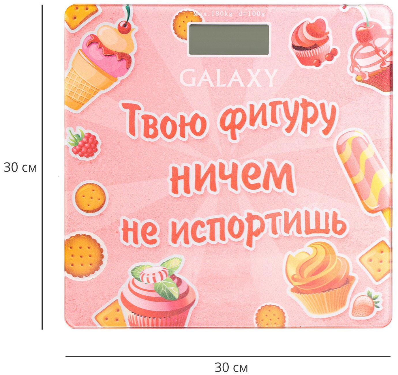 Galaxy Весы напольные GL 4831 созданы для тех, кто следит за фигурой и здоровьем, но не обделен чувством юмора. Весы выполнены из высокопрочного немецкого стекла, на котором не возникнет случайных пятен, царапин или других повреждений. Очевидным преимуществом данной модели является сверхточная сенсорная система датчиков: цена деления - 0,1 кг, максимальный вес – 180 кг! Индикация перегрузки уведомит о превышении допустимой массы, если это произойдет. Индикатор низкого уровня заряда и функция автоматического отключения продлевает работоспособность прибора за счет экономии элемента питания CR2032, 1 шт. (в комплекте). Запас энергии не расходуется в режиме ожидания. Напольные электронные весы Galaxy имеют прорезиненные ножки для устойчивости и предотвращения скольжения. Оригинальный дизайн и функциональность делают данную модель замечательным подарком себе и близким. Особенности: Элемент питания CR2032, 1 шт. (в комплекте) Сверхточная сенсорная система датчиков Платформа из высокопрочного немецкого стекла Жидкокристаллический дисплей Максимально допустимый вес, кг: 180 Цена деления, кг: 0,1 Автоматическое отключение Индикация перегрузки Индикация низкого уровня заряда элементов питания Единицы измерения: килограмм, фунт, стоун Прорезиненные ножки