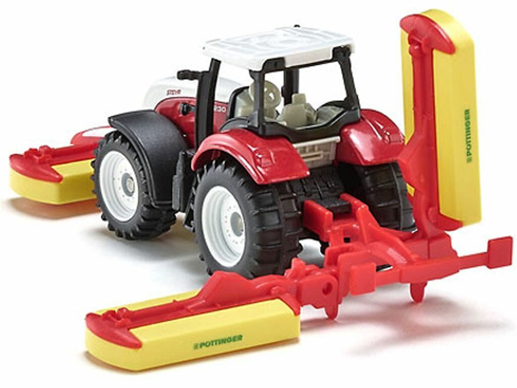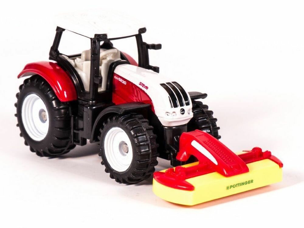 от немецкого производителя Siku сможет познакомить ребенка со сложной сельскохозяйственной техникой, а также станет достойным пополнением для коллекционеров. Трактор Steyr с косилками P?ttinger выполнен в красном, белом и черном цветах и выглядит очень реалистично. Корпус выполнен из металла, кабина и косилки из пластика, колёса вращаются, модельку можно катать. Косилки отсоединяются от трактора, задняя косилка складывается для более удобной транспортировки. С трактором можно играть отдельно. Тщательно проработанные детали трактора делают его максимально реалистичным и интересным для игры. Трактор достойно украсит коллекцию каждого любителя моделей сельскохозяйственной техники.