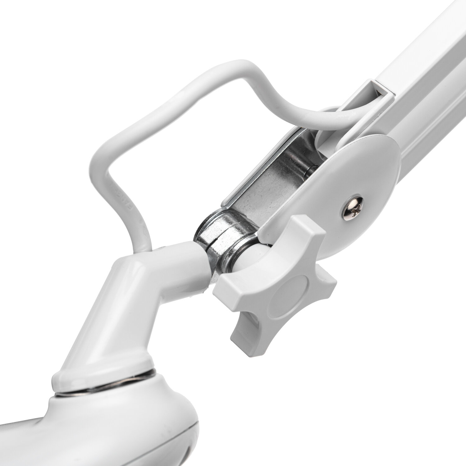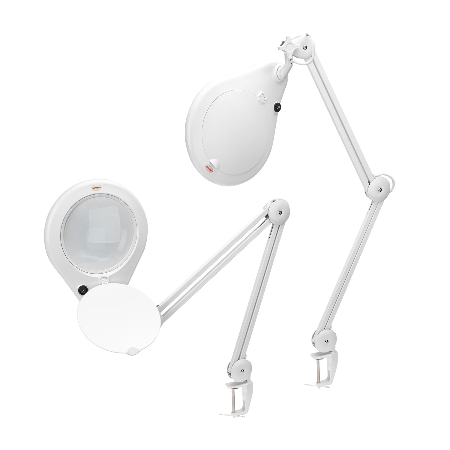 "Лупа на струбцине круглая настольная 5Х с подсветкой 108 LED, белая REXANT предназначена для визуального увеличения различных мелких предметов или их фрагментов. Она используется в косметологии, при выполнении ювелирных и радиомонтажных работ, при ремонте часов, в биологии и медицине, для организации труда людей со слабым зрением, а также для других работ, где требуется дополнительное увеличение и подсветка рабочего поля. Такая оптическая система состоит из линзы, удобного пантографического механизма и бестеневой подсветки. Основные преимущества: 1. Линза изготовлена из стекла. Обеспечит наиболее четкое изображение с минимальным уровнем искажения
