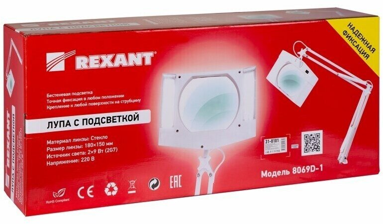 Лупа Rexant на струбцине квадратная настольная 3Х с подсветкой белая 31-0101
