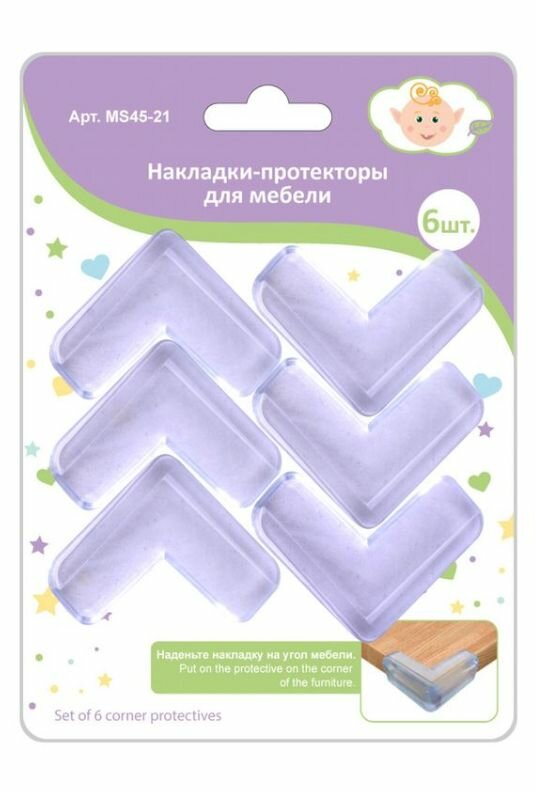 Накладки-протекторы - незаменимы, если в Вашем доме есть маленький ребенок! Накладки-протекторы предназначены для размещения на острых углах мебели и бытовой техники. Использование этих накладок-протекторов обезопасит Вашего малыша от случайных столкновений с твердыми предметами и смягчит удар, если это произойдет. Благодаря своей прозрачности, они не испортят интерьер вашего дома и будут почти незаметны на углах мебели. В комплект входят липкие двусторонние фиксаторы, которые помогут надежно закрепить накладки-протекторы на углах.