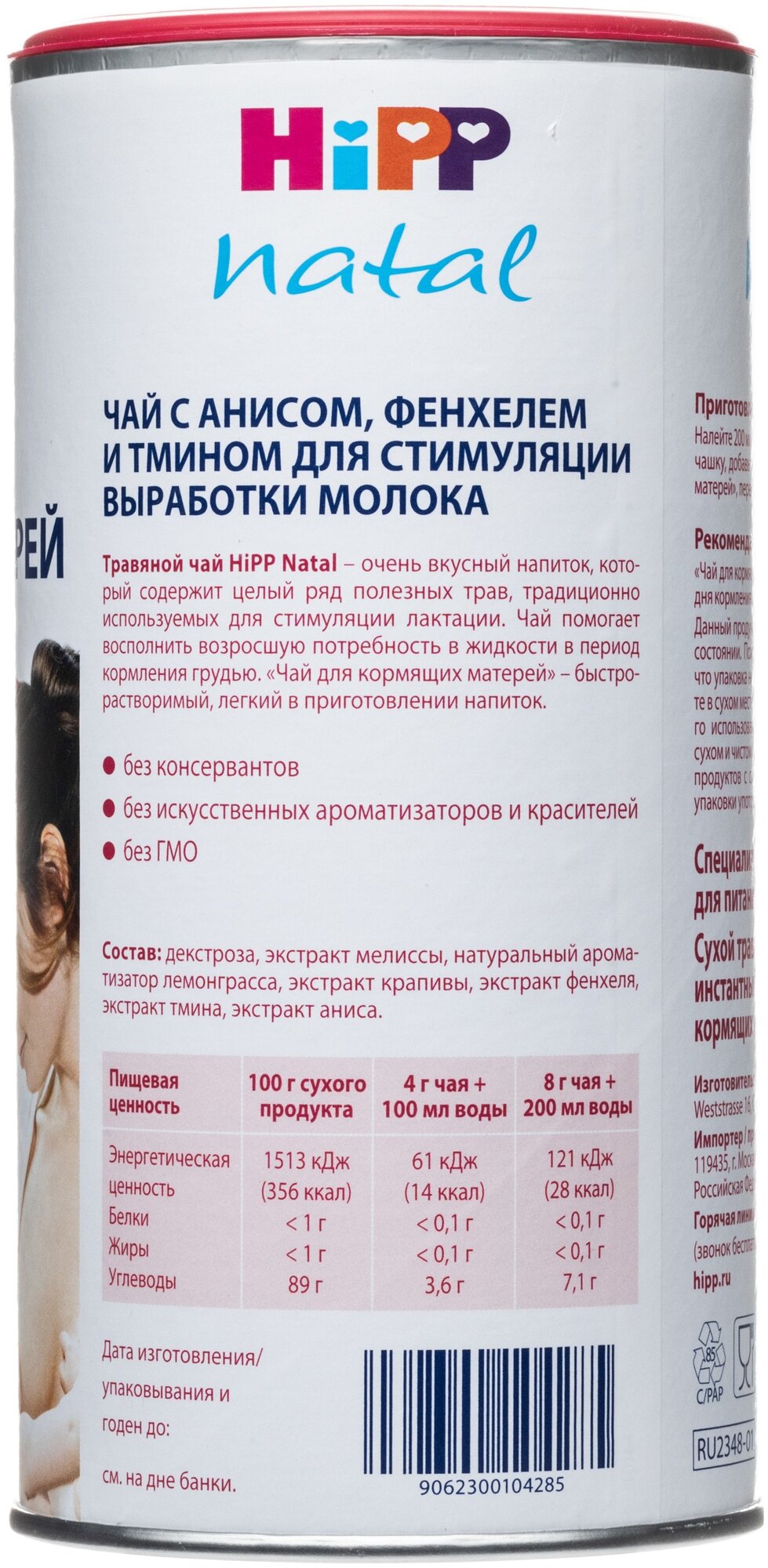 | Способ приготовления | Налейте в чашку 200мл свежевскипячеой теплой или холодной воды, добавьте 4 чайные ложки "Чая для кормящих матерей HiPP" и размешайте. Ежедневно выпивайте по 2 чашки напитка. |