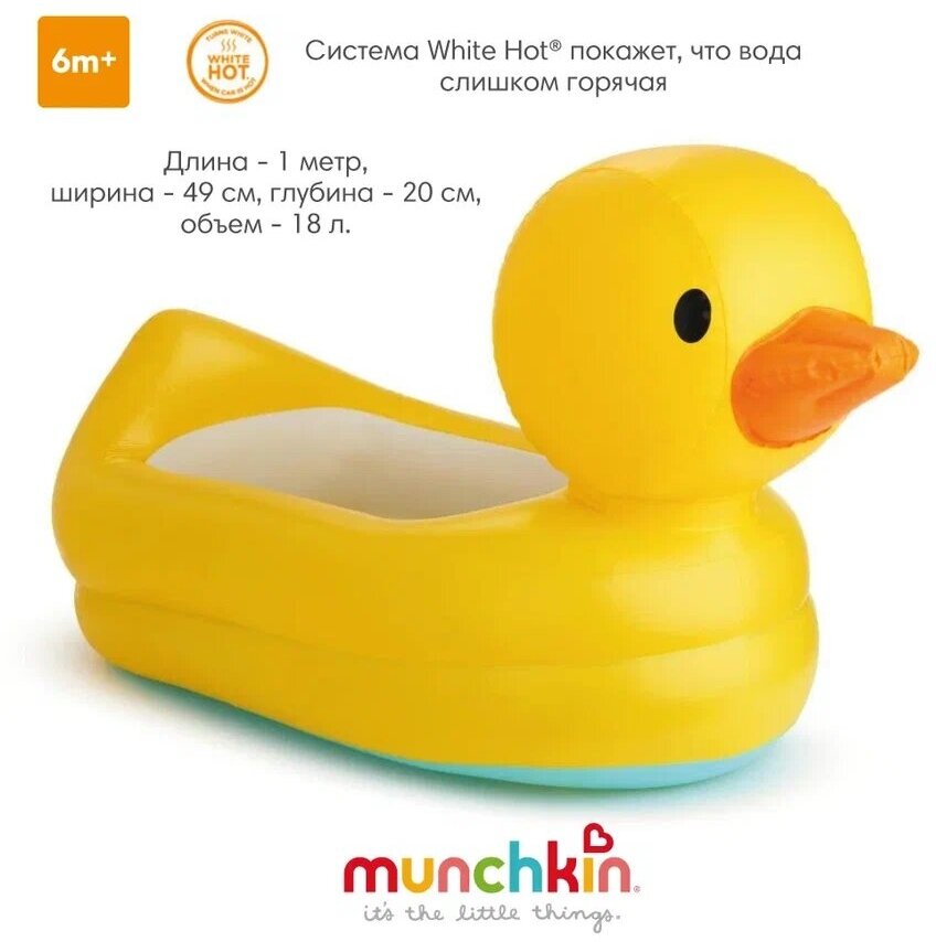 Безопасная надувная ванна Munchkin в виде утки White Hot® (с контролем температуры воды). Вы можете быть уверены, что температура воды в ванночке как раз такая, как это необходимо. Индикатор безопасности White Hot ™ в нижней части ванночки показывает слово «HOT», когда вода слишком горячая и становится синим, когда она имеет нужную температуру. Очаровательная форма ванночки в виде большой забавной утки имеет удобный контурный подголовник.