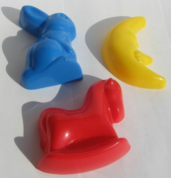 Формочки ярких, сочных цветов пригодятся для игр в песочнице, а также как альтернатива дорогим формочкам для застывания мыла. С помощью набора можно сделать фигурки зайчика, лошадки и полумесяца. В ванной формочки пригодятся для различных сюжетных игр. Ведь у малыша будет целых три персонажа для интересной сказки! Внимание! Цвет элементов набора может отличаться от представленного на фото.