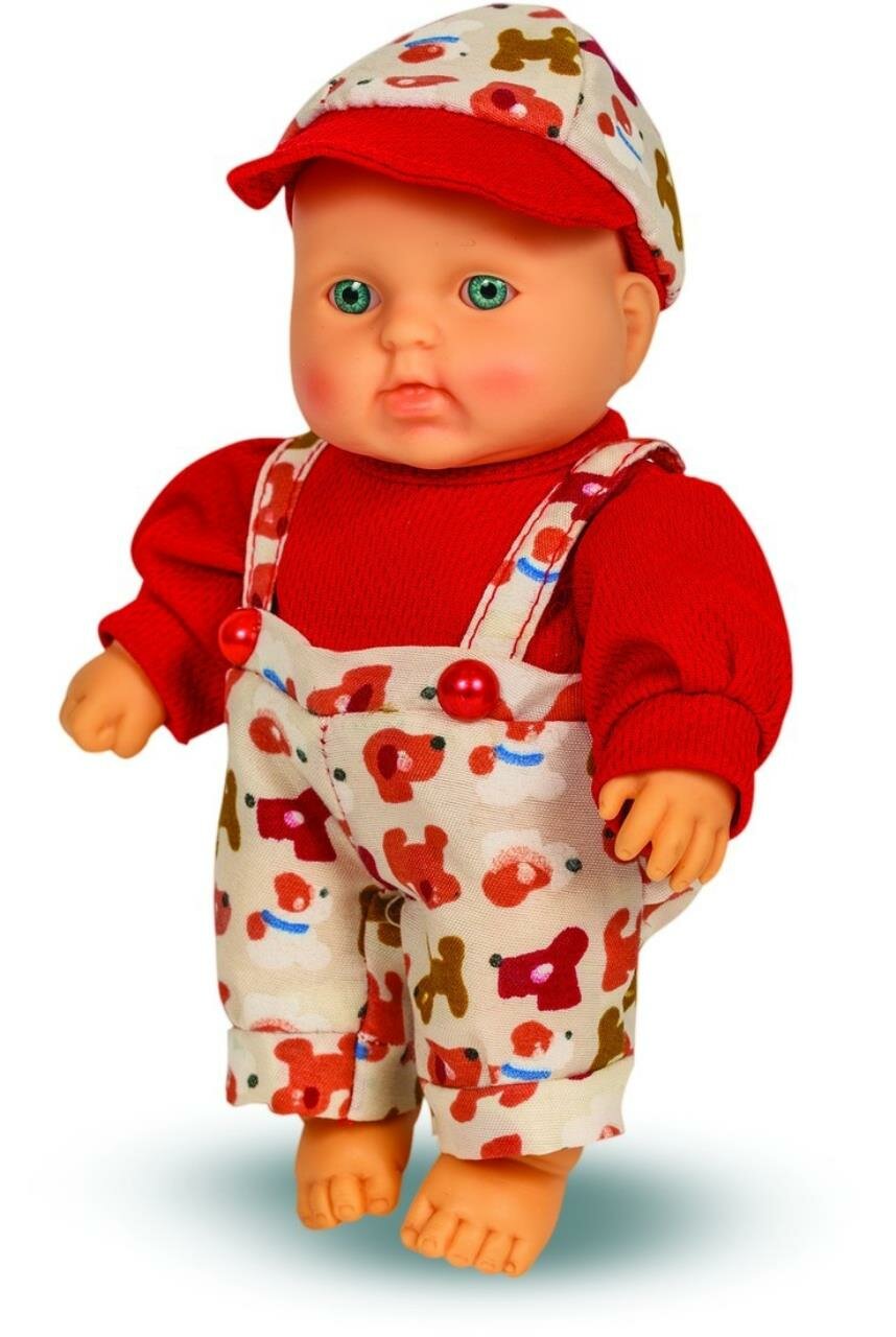 Карапуз Весна 8 (мальчик) - кукла из серии Малыши и малышки имеет анатомическую особенность, указывающую на её пол:мальчик. В комплект одежды входит: кофточка, штанишки на лямках и шапочка из трикотажа. Производитель оставляет за собой право изменения цветовой гаммы одежды куклы, цвет глаз может варьироваться. Кукла представляет собой образ младенца - мальчика с милым личиком, пухленькими щёчками. Куклу так и хочется взять на ручки и позаботиться о ней. Игровые возможности куклы: благодаря небольшому размеру и продуманной конструкции эту куклу легко и удобно брать в руки, её можно сажать, укладывать спать, переодевать. Куклу можно купать, так как у неё вставные не закрывающиеся глазки, рельефный кукольный паричок и нет звукового устройства. Эта кукла подходит для сюжетных игр и разнообразных игровых действий ребёнка. Высота 20 см. Тело куклы пропорционально и гармонично, полностью выполнено из эластичного приятного на ощупь винила. Кукла соответствует Техническому регламенту Таможенного Союза о безопасности детской игрушки. Дополнительно к кукле можно приобрести комплект одежды.