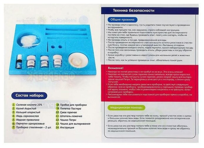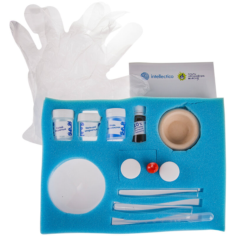 | Комплектация | йодистый калий, медь сернокислая, раствор соляной кислоты 10%, медная проволока, одноразовые перчатки, пипетка Пастера, стеклянная пробирка, сухое горючее, чаша Петри, шпатель-ложечка, чашка для выпаривания. |