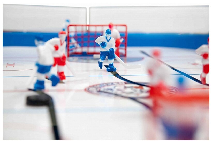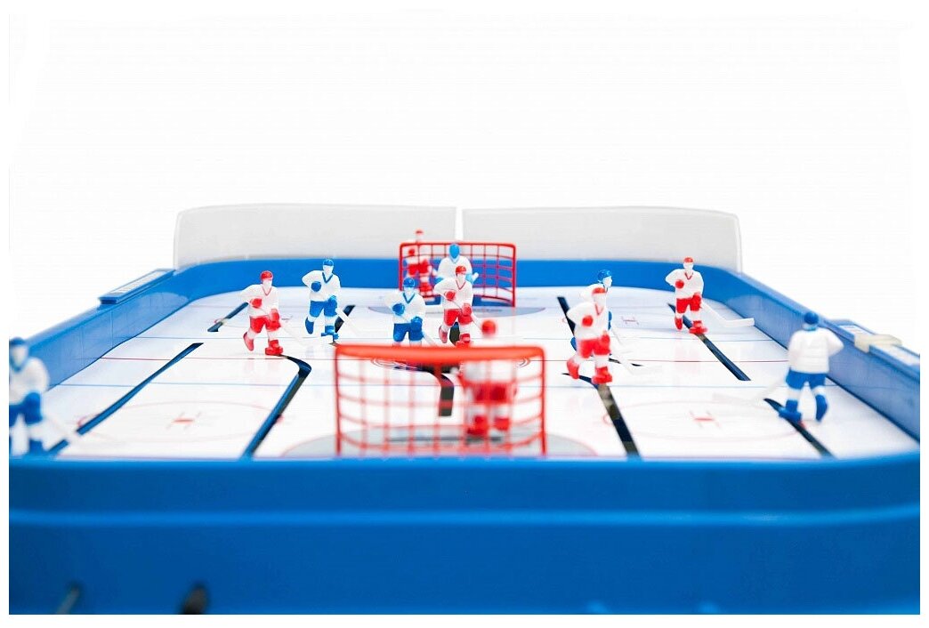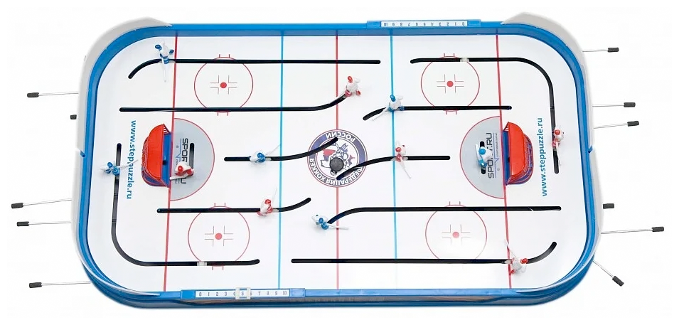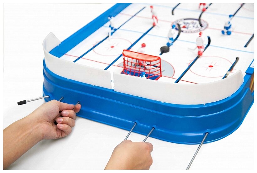 Игроки управляются с помощью стержней с резиновыми ручками. Счет ведется на механизированном табло. Настольная игра бывает уже собрана, остается установка сеток и хоккеистов, и приступать к игре!
