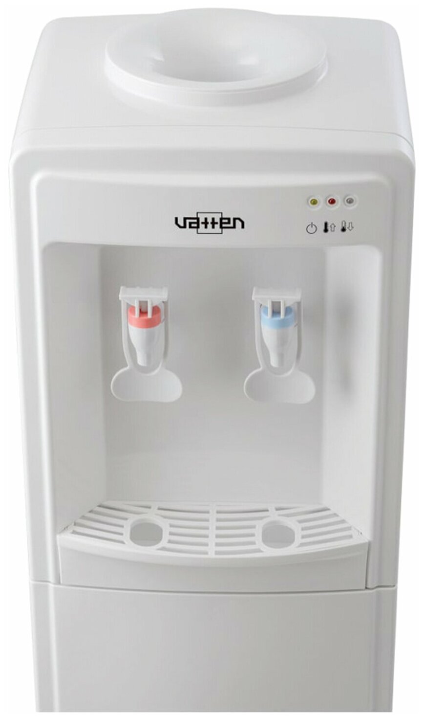 VATTEN - напольный кулер с верхней загрузкой бутыли. Электронная система охлаждения воды. Высокая производительность. Подача воды из двух краников нажатием кнопки. Кнопка подачи горячей воды оснащена системой защиты от случайного ошпаривания (защита от детей). Цвет корпуса - белый. Подходит для установки в офисе.