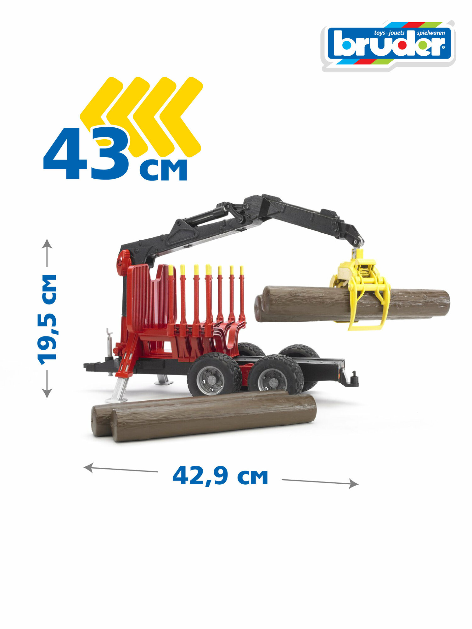 Модель Bruder выполнена в точной копии с оригинала в масштабе 1:16. Прицеп с манипулятором предназначен для перевозки леса. Расстояние между держателями брёвен можно отрегулировать.