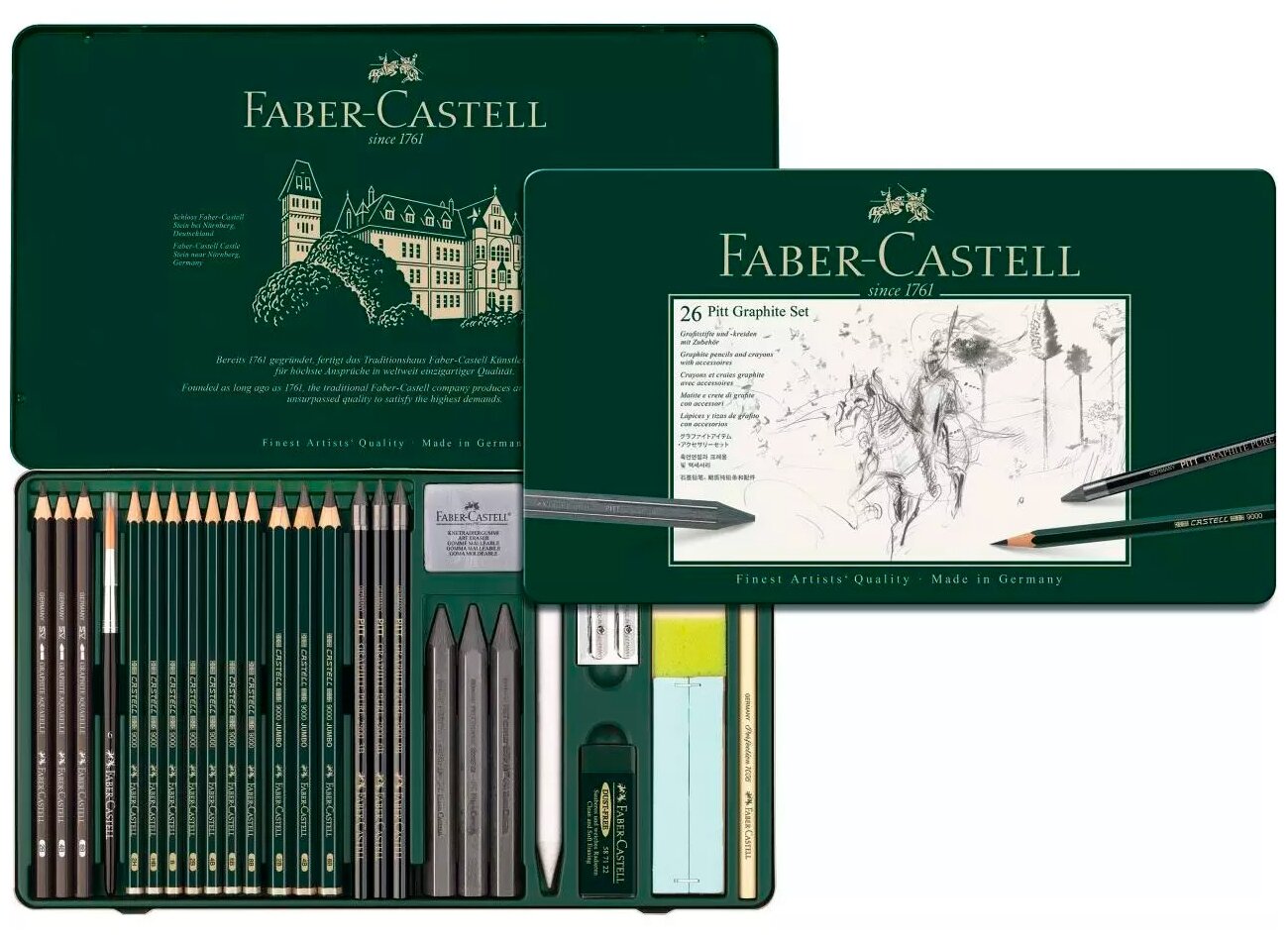 Набор профессиональных художественных чернографитных письменных принадлежностей Pitt Graphite. Набор состоит из 7 чернографитных карандашей Castell 9000 твердостью 2H, HB, B, 2B, 4B, 6B и 8B, 3 чернографитных карандашей в утолщенном корпусе Castell 9000 Jumbo твердостью 2B, 4B и 8B, 3 акварельных чернографитных карандашей Graphite Aquarelle твердостью 2B, 4B и 8B, 3 чернографитных карандашей Pitt Graphite Pure твердостью 3B, 6B и 9B, 3 чернографитных мелков Pitt Graphite crayon твердостью 2B, 6B и 9B, кисти, 3 ластиков, точилки, растушевки и деревянного бруска с наждачной бумагой.