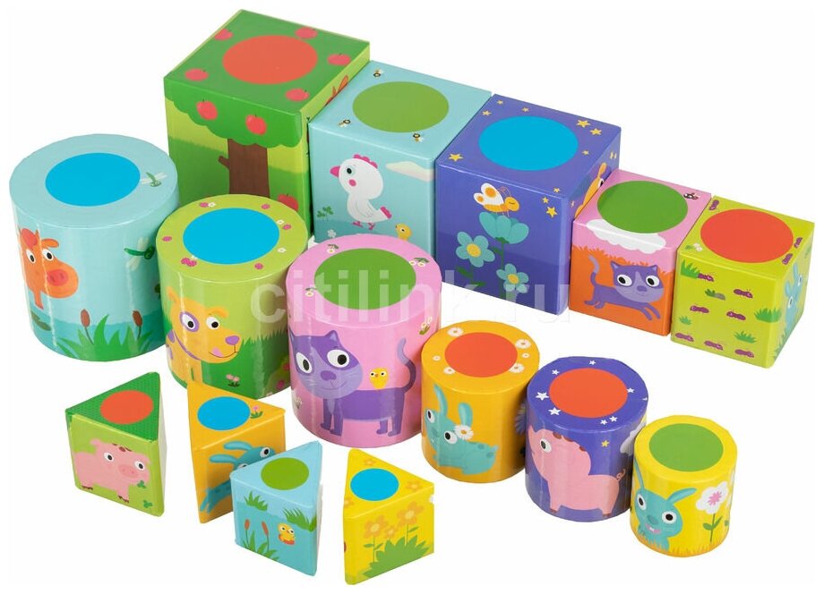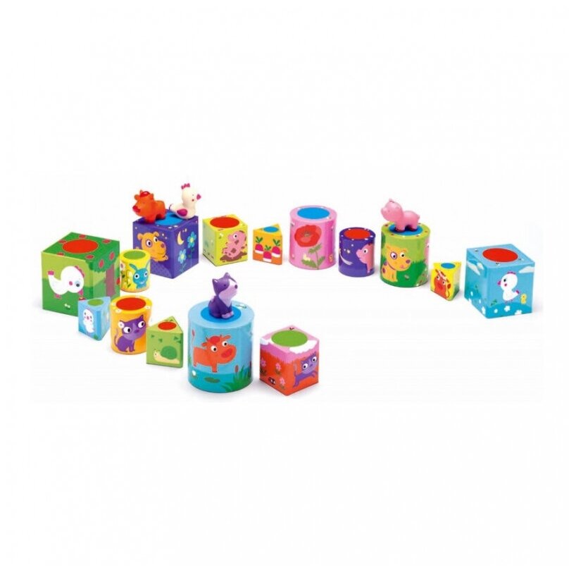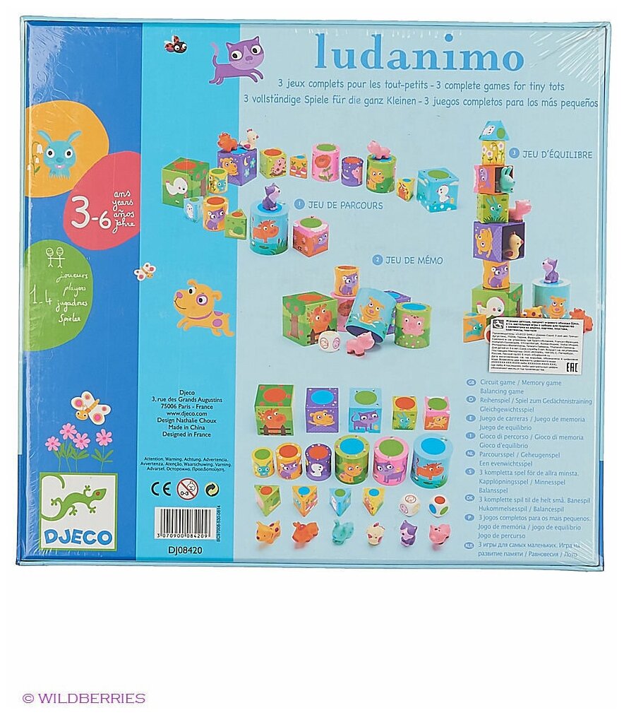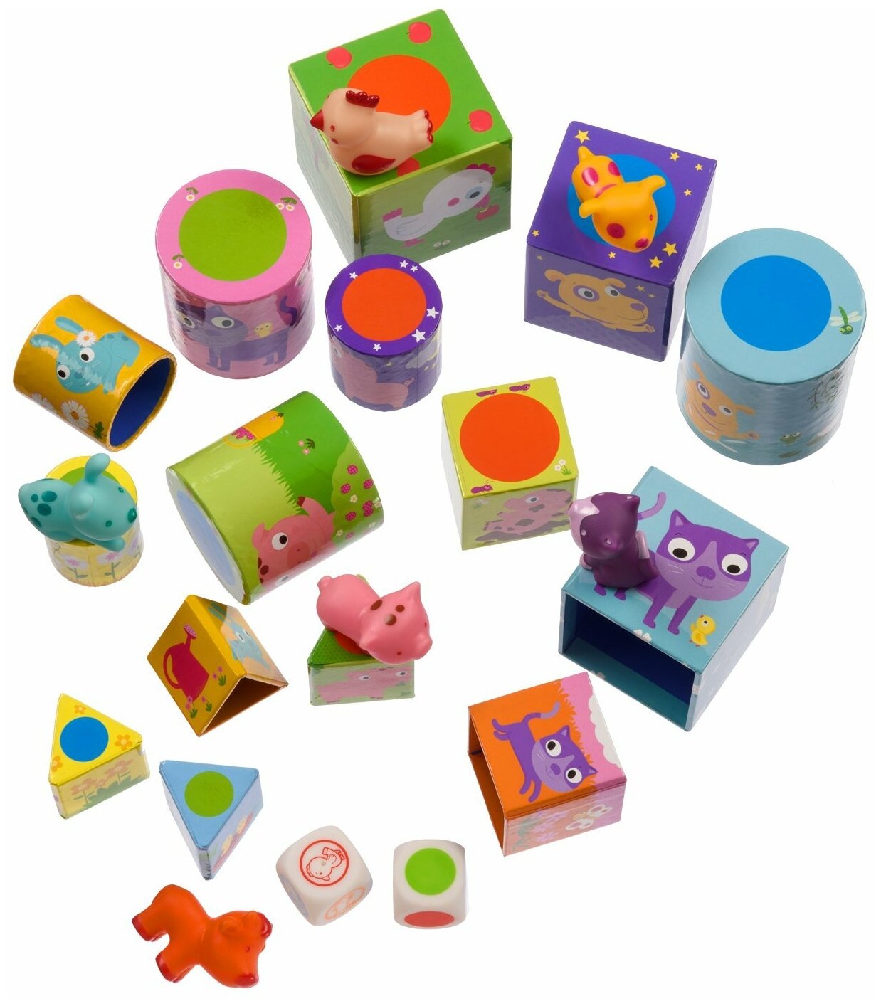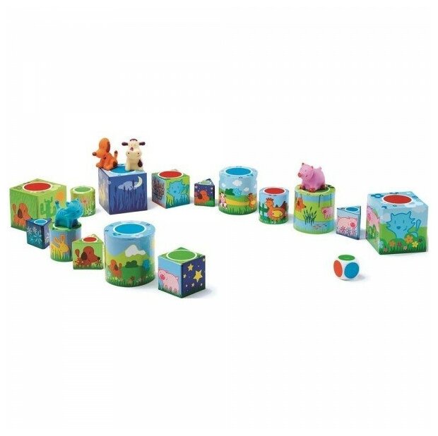 Djeco. Вся продукция фирмы Djeco направлена прежде всего на творческое развитие ребенка и способствуют эстетическому воспитанию малышей и детей старшего возраста. Более 30 дизайнеров принимают участие в разработке этих шедевров, каждый из которых является уникальным. 1 кубик «животные», 1 кубик «цвета», 15 кубов «фигура» (5 квадратов, 6 кругов и 4 треугольника), цвет которых определяет кружок сверху, 6 животных.