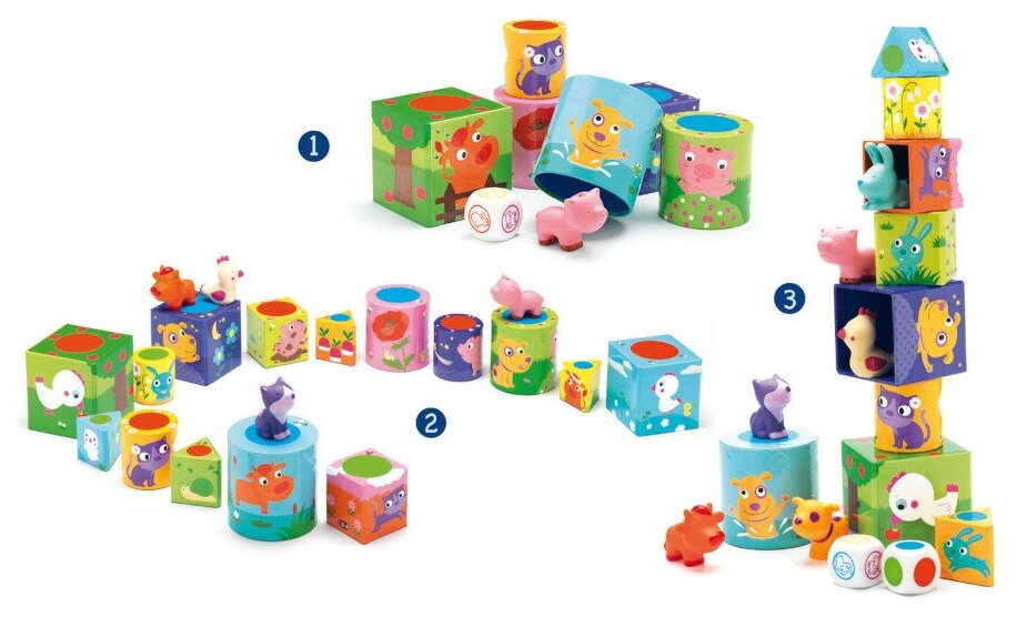- Версия 2: С одним кубиком «цвет» и одним кубиком «животные». Дети по очереди бросают оба кубика. Кубик «цвет» определяет, какой куб ребенок должен взять и поставить. Кубик «животное» определяет животное, которое ребенок должен взять и поставить. При каждом ходе игрок выбирает, взять куб или животное, соответствующие выпавшему кубику. Если в конце партии не остается ни куба, ни животного, выпавших на обоих кубиках, игрок пропускает свой ход. Элементы нагромождают одни над другими, одни в другие, чтобы сформировать пирамиду. Игрок, который завалит пирамиду, проигрывает.