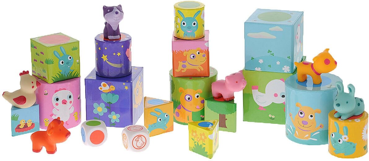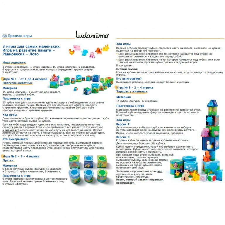 | Комплектация | 6 фигурок животных, 2 кубика, 12 строительных блоков |
