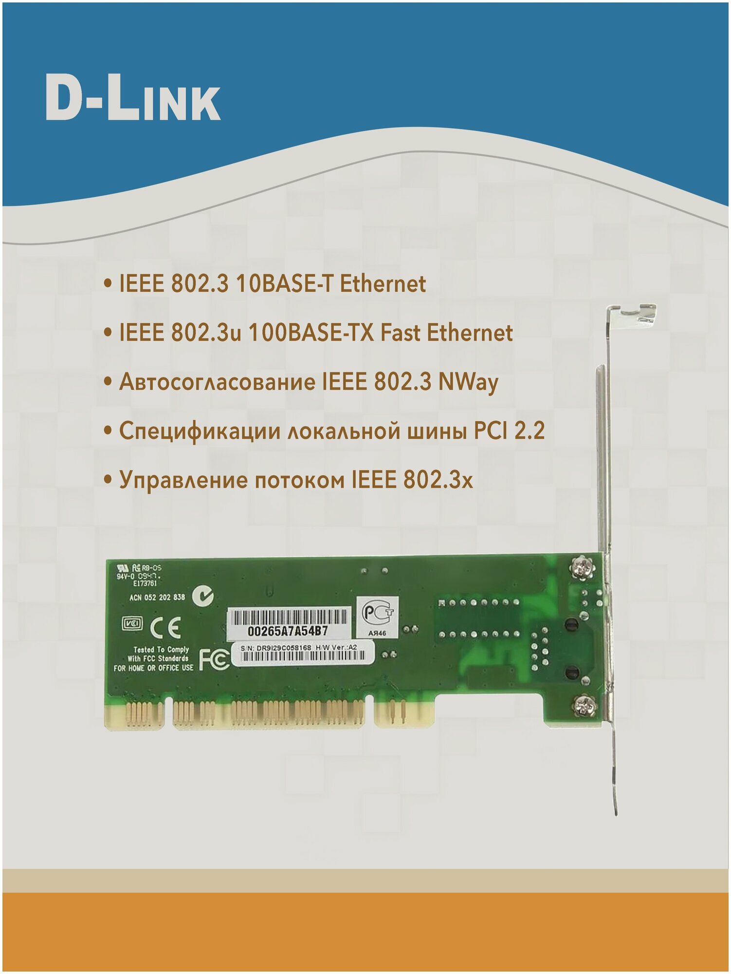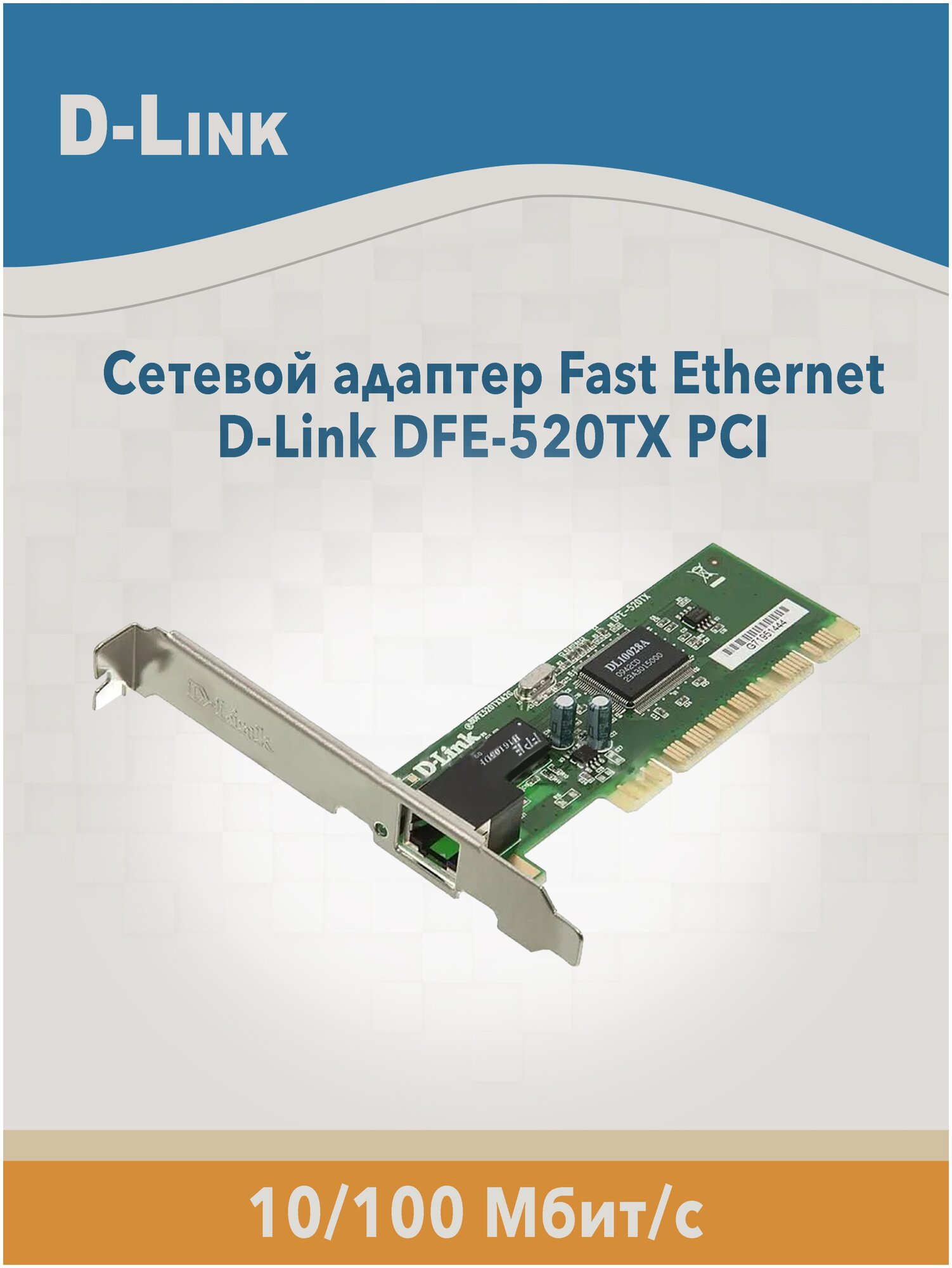 - экономичный сетевой адаптер с автоматическим определением скорости 10/100 Мбит/с, устанавливаемый в ПК со слотом расширения PCI. Этот адаптер использует однокристальную технологию и оборудован встроенным буфером типа «очередь», обеспечивая возможность простого подключения компьютера к сети Ethernet.
