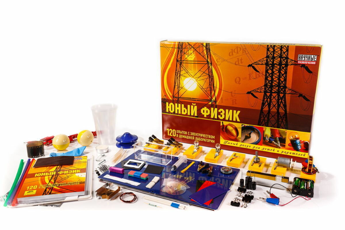 | Комплектация | металлический лист, 2 лампочки на подставке, батарейный блок, электролитические конденсаторы разной емкости, электроды, 2 шарика, катушка, мотор со шкивом и шестерней, фотодиод, переменный резистор, подставки, компас, шприц, 6 проводов, электроды, фольга, экраны, магнит, стеклянная палочка, пластиковые трубки, пластиковые стаканчики. |
