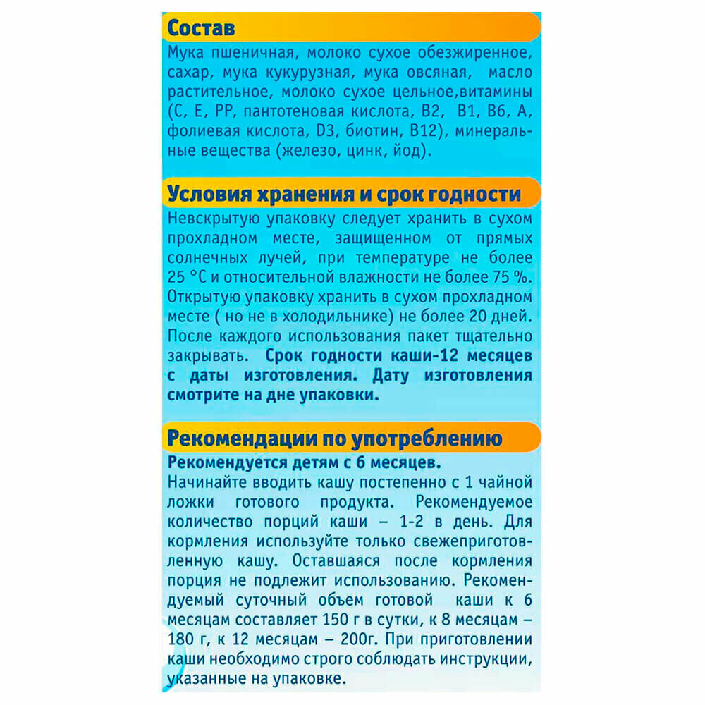 | Состав | Мука пшеничная, молоко сухое обезжиренное, сахар, мука кукурузная, мука овсяная, масло кукурузное, молоко сухое цельное, пребиотик-инулин, витамины (С, Е, РР, пантотеновая кислота, В2, В1, В6, А, фолиевая кислота, D3, биотин, В12), минеральные вещества (железо, цинк, йод)/ |