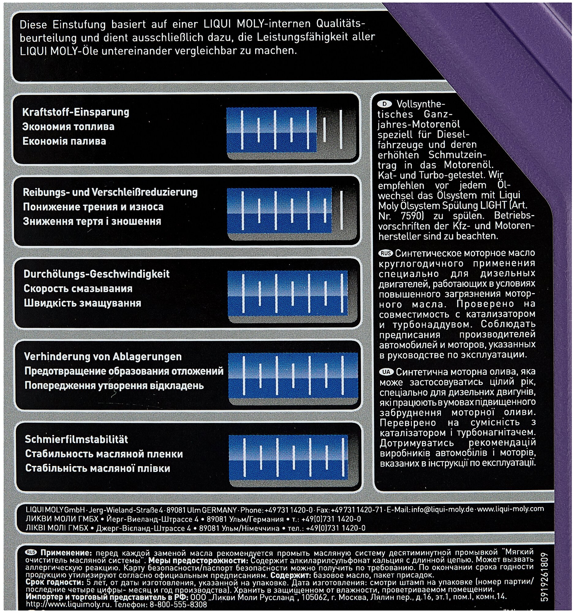 Полностью синтетическое низковязкое моторное масло на базе полиальфаолефинов, для всесезонного применения в дизельных двигателях современных автомобилей с повышенным содержанием моющих и диспергирующих присадок. Применяется на высоконагруженных многоклапанных моторах, в том числе с турбонаддувом и интеркулером. Масло выдерживает высокие нагрузки и большие температуры и обладает очень низким расходом на угар. Низкая низкотемпературная вязкость позволяет заводить двигатель при больших отрицательных температурах и беспрепятственно прокачивать масло по системе, обеспечивая тем самым надежную смазку всех деталей двигателя. Совместимо с каталитическими нейтрализаторами всех типов.