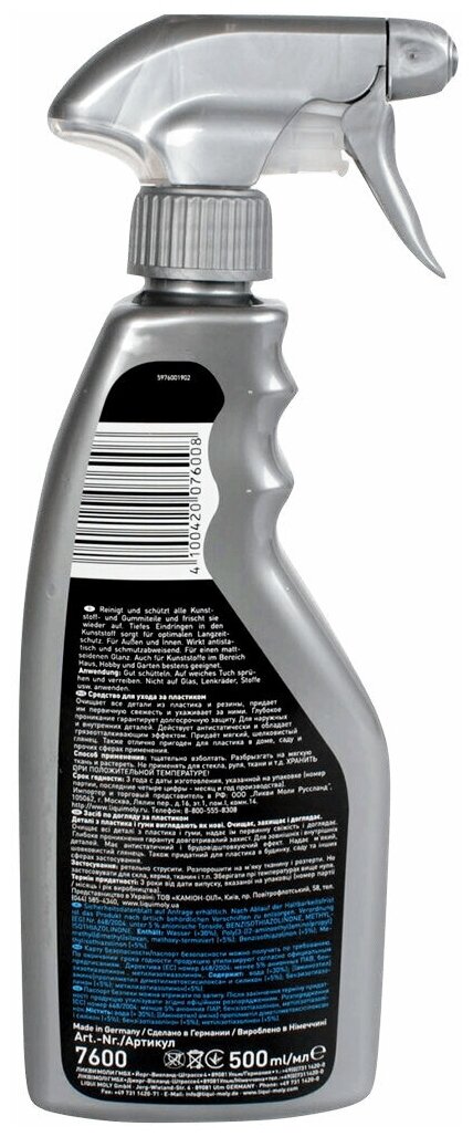 Сохранить автомобиль или другое транспортное средство в отличном состоянии – это задача, требующая постоянного ухода и внимания. Особенно важно правильно ухаживать за пластиковыми и резиновыми деталями, чтобы они не теряли свою яркость и насыщенность цвета со временем. В этом процессе незаменимым помощником станет 0,5л – средство, специально разработанное для очистки, защиты и ухода за пластиком. обладает уникальной формулой, которая позволяет эффективно очищать пластиковые и резиновые детали от грязи, пыли и других загрязнений. Благодаря своей мягкой текстуре, средство не повреждает поверхность и не оставляет царапин. Оно также восстанавливает яркость и насыщенность цвета, делая детали автомобиля или другого транспортного средства выглядящими как новые.Средство не только очищает и восстанавливает, но и обеспечивает долговечную защиту пластиковых и резиновых деталей. Средство создает невидимую защитную пленку, которая предотвращает воздействие ультрафиолетовых лучей, агрессивных химических веществ и других негативных факторов окружающей среды. Спрей для ухода за пластиком ликви моли продлевает срок службы деталей и сохраняет их эстетический вид на протяжении длительного времени.Средство 0,5л очень просто использовать. Достаточно нанести небольшое количество на мягкую тряпку или губку и равномерно распределить по поверхности пластика или резины. Затем следует аккуратно вытереть поверхность до полного впитывания средства. Благодаря своей консистенции, средство легко наносится и не оставляет следов или разводов.Liqui Moly 0,5л – это незаменимое средство для ухода за пластиковыми и резиновыми деталями автомобилей и других транспортных средств. Оно не только очищает и восстанавливает детали, но и обеспечивает им долговечную защиту. Простота использования делает средство доступным для каждого, кто стремится сохранить эстетический вид своего автомобиля или транспортного средства на высоком уровне. Не откладывайте заботу о своем транспортном средстве на потом – воспользуйтесь и наслаждайтесь его безупречным внешним видом на протяжении многих лет.