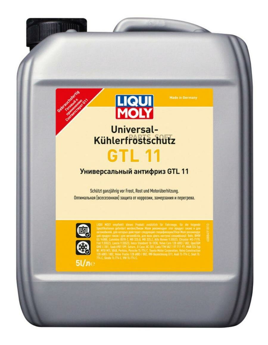 Universal Kuhlerfrostschutz GTL11 - антифриз на основе этиленгликоля и присадок гибридного класса первого поколения. Обеспечивает отличную защиту от замерзания, ржавчины, а также от перегрева. При смешивании с водой обеспечивает надежную защиту системы охлаждения автомобиля при круглогодичном его применении. Образует приповерхностный слой, эффективно защищающий от коррозии. Рекомендуется на интервал замены от двух лет.