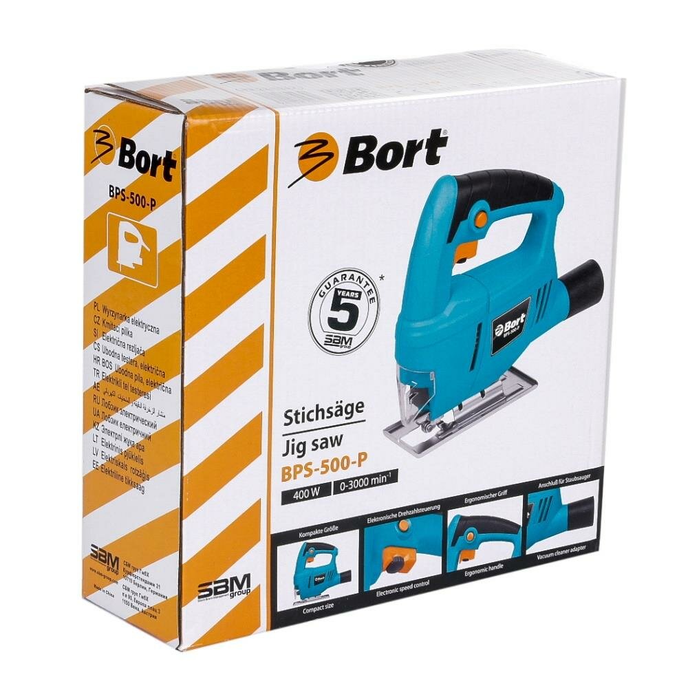 Лобзик Bort представляет собой бытовой прибор, предназначенный для древесины, пластика и металла. Мощность составляет 550 Вт, а скорость (с возможностью регулировки) - 3300 оборотов в минуту. Угол наклона подошвы может быть настроен пользователем. Также отличительной особенностью данной модели является маятниковый механизм, значительно ускоряющий работу устройства. Данный момент особенно важен при серийном производстве заготовок.