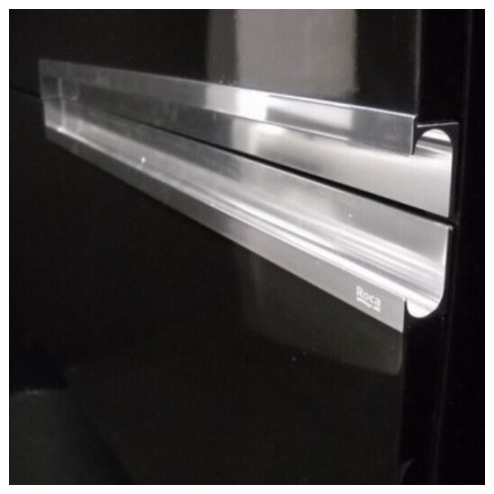 Ну а теперь к тумбе. Красивая белоснежная глянцевая поверхность с утопленными ручками из алюминия с логотипом roca. Отпечатков на поверхности не остается.Достоинства: