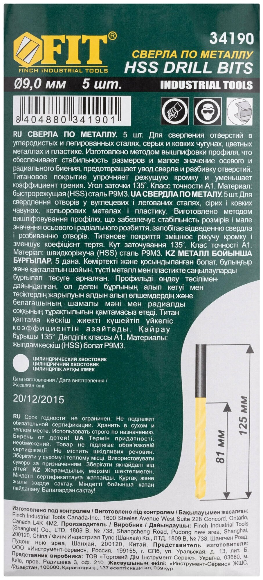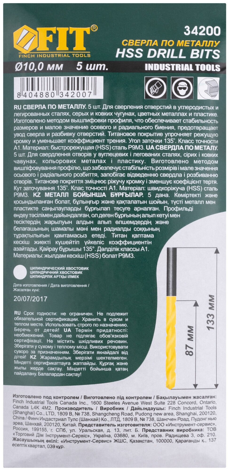 Сверла FIT HSS по металлу, титановое покрытие 10,0 мм ( 5 шт.)