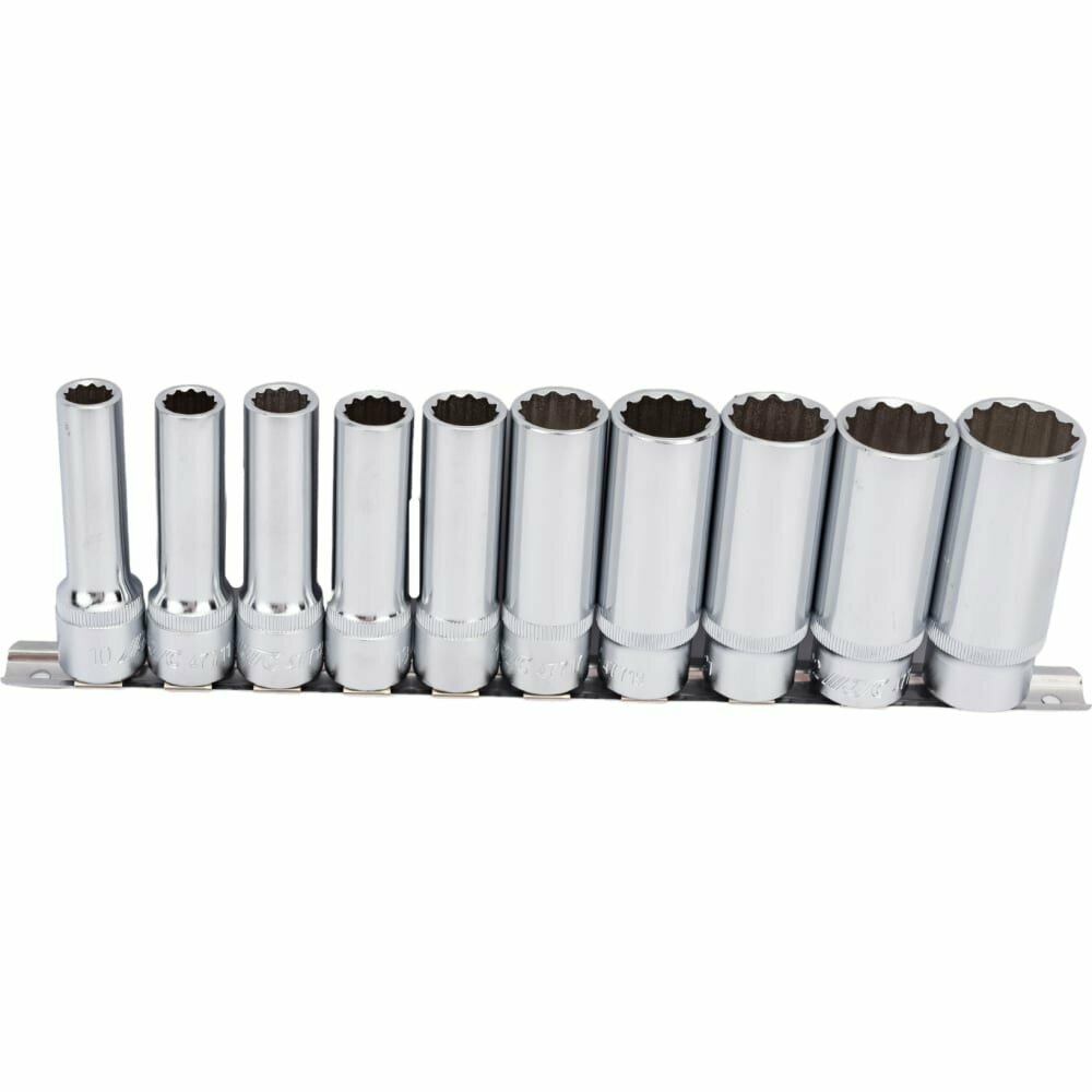 Набор глубоких двенадцатигранных торцевых головок 1/2" 10-24 мм L=76 мм 10 шт. Головки изготовлены из закаленной хром-ванадиевой стали. Полированная поверхность. В набор входит планка крепления и хранения головок.