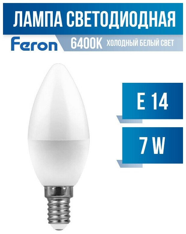 Лампочка светодиодная свеча E14 7W 6400K 560lm - продукт известной компании Feron (Китай).