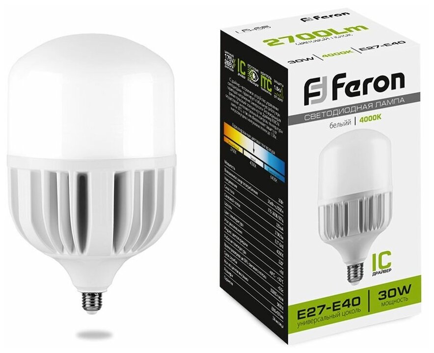 Feron LB-65 E27 30W 4000K 230V - это надежная светодиодная лампа с цоколем Е27. Данная лампа способна обеспечить световой поток до 2700Лм и обладает широким углом рассеивания светового пучка. Одним из ключевых достоинств данной лампы является ее чрезвычайно продолжительный срок службы, который обеспечивается использованием в ее конструкции исключительно высококачественных элементов. Кроме того, данная лампа обладает низким энергопотреблением и оптимально подойдет для использования, как в качестве основного, так и дополнительного источника света в помещении.