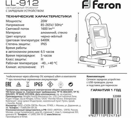 Прожектор уличный светодиодный с зарядным устройством IP65 - продукт известной компании Feron (Китай). Имеет максимальную мощность 20 Вт. Отлично подойдет для таких мест, как кафе, магазин, сад. Впишется в интерьеры следующих стилей: техно.