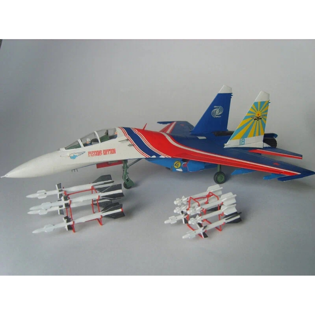 Красочная и более крупная модель для сборки чем стрижи. В комплект не входят краски, но краски используются основных цветов: синий, белый, красный. Модель после установки всего вооружения и ракет становиться немного тяжелой по весу, но это только добавляет ей правдоподобности. В сборке и покраске - не сложная, подходит как взрослым, так и детям.