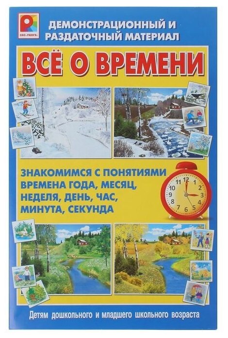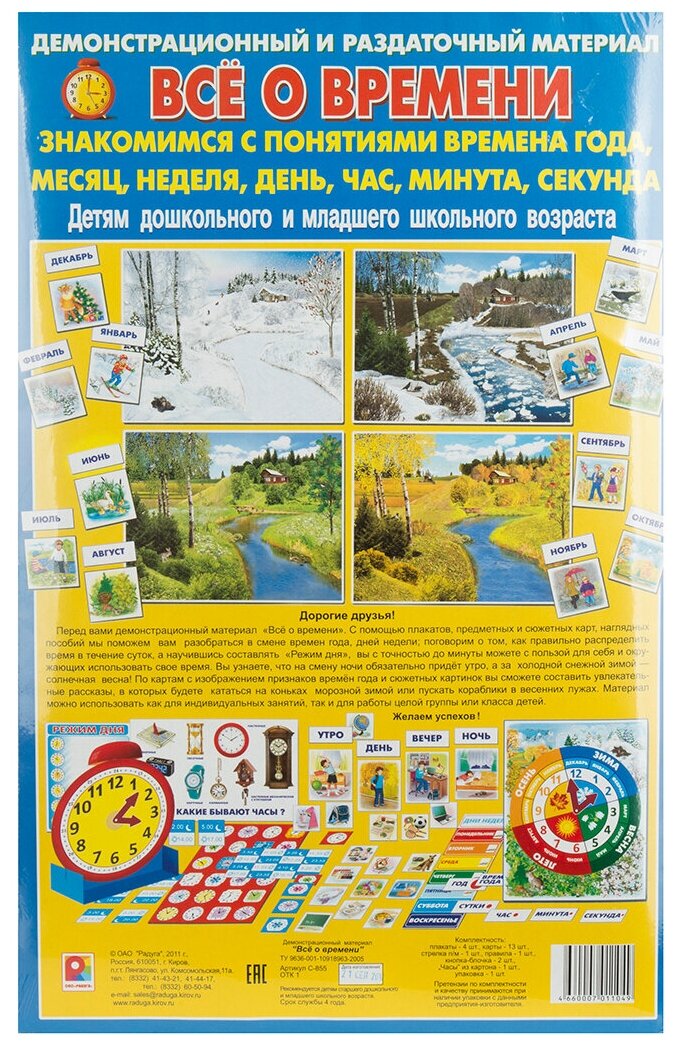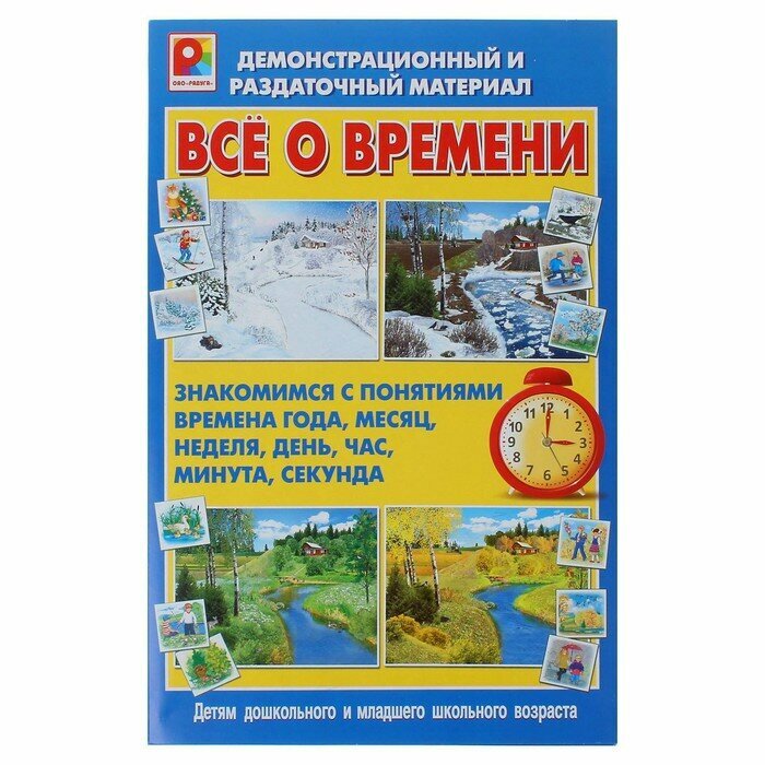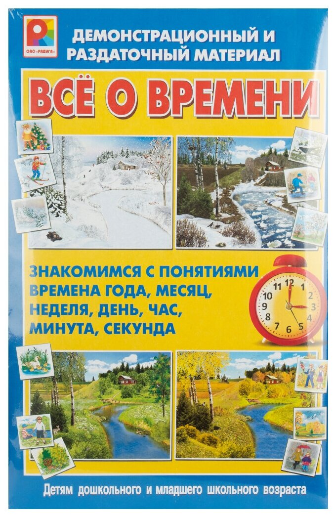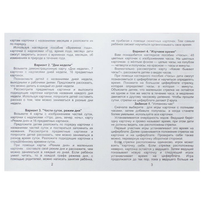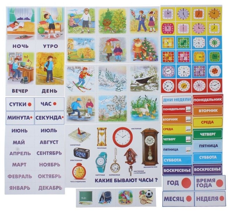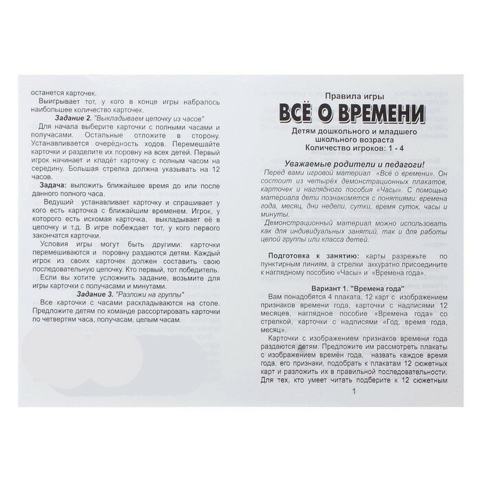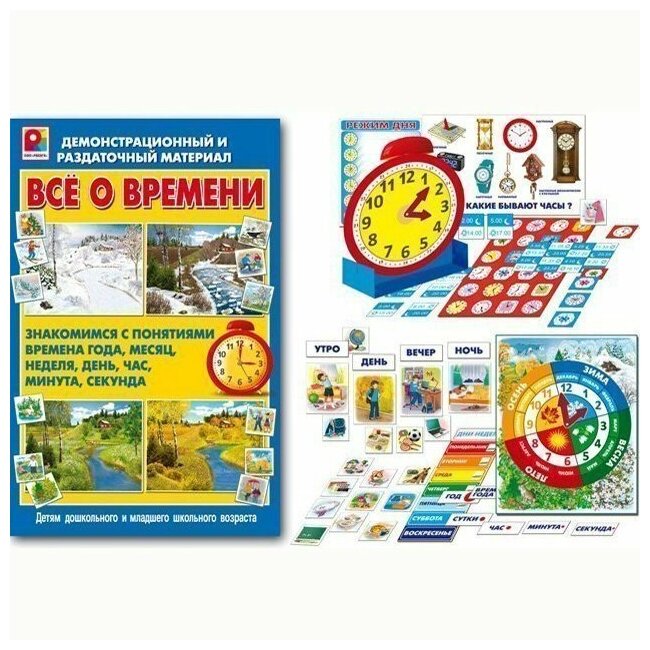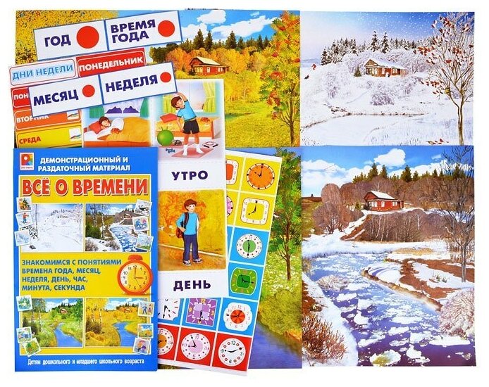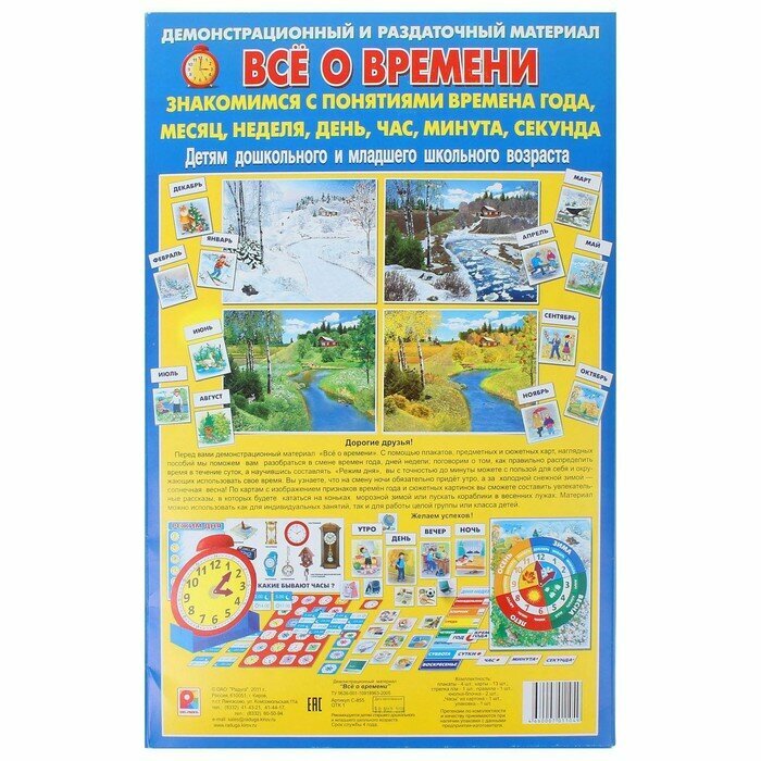 С помощью представленного демонстрационного и раздаточного материала дети познакомятся с понятиями: времена года, месяц, дни недели, сутки, время суток, часы и минуты. Демонстрационный материал можно использовать как для индивидуальных занятий, так и для работы целой группы или класса детей. В игре могут принимать участие от 1 до 4 человек. Длительность игры - 30-45 минут.