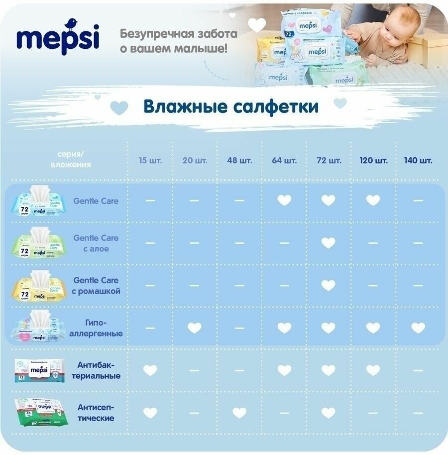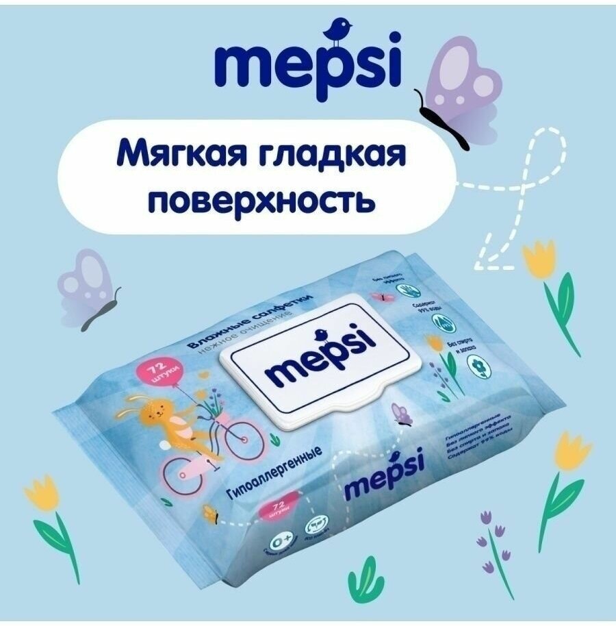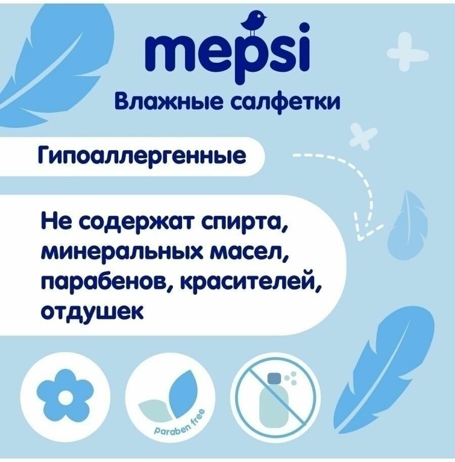 Гипоаллергенные детские влажные салфетки Mepsi прекрасно подойдут для ежедневного ухода за нежной кожей младенцев. Салфетки сделаны из мягкого сетчатого материала, не содержат спирта и не имеют запаха. Они бережно удалят загрязнения, обеспечивая уход и чистоту при смене подгузника. Благодаря практичной упаковке с пластиковым клапаном салфетки не будут пересыхать, а компактный размер позволит держать их всегда под рукой. Особенности: Не имеют запаха. Не содержат спирта. Легко и бережно удаляют загрязнения.