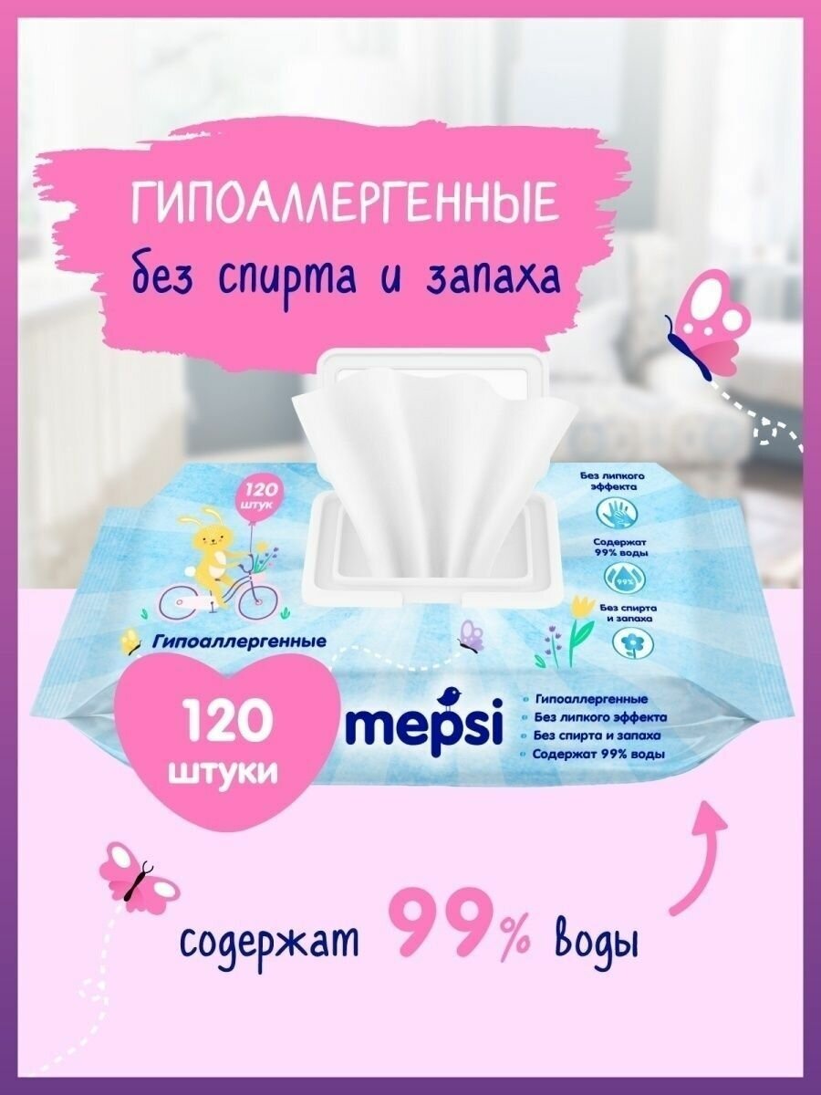 Мягкие и нежные детские салфетки "Mepsi" созданы из нетканого полотна специально для очищения нежной кожи малышей. Раствор, которым пропитаны салфетки, не содержит спирта и запаха. Влажные рельефные салфетки бережно очищают, увлажняют и защищают чувствительную кожу ребенка. Предотвращают прилипание. Гипоаллергенные. Проверено дерматологами.