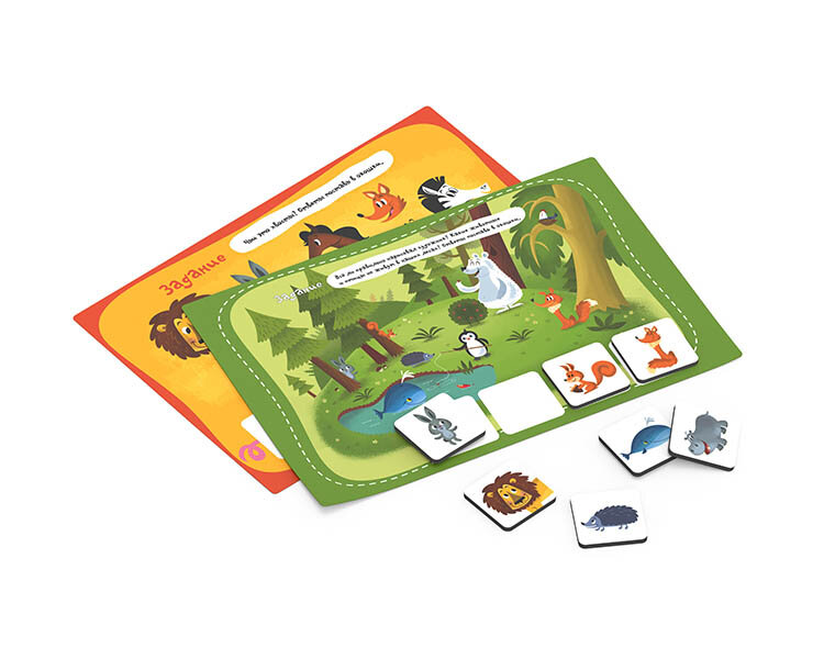 Комплектация | 27 магнитных элементов с животными, 15 заданий, игра-ходилка |