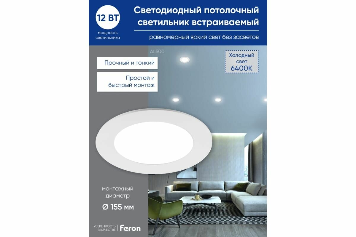 Светильник встраиваемый светодиодный, ультратонкий (ДВО) FERON AL500, 12W 6400К (дневной), 175-265V, 1010Lm, IP40, угол рассеивания 120°, цвет белый, корпус алюминий, рассеиватель матовый акриловый полимер, 170*170*18 мм, монтажн.отв. 155*155 мм.. Встраиваемые светодиодные светильники AL500 TM Feron артикул предназначены для освещения помещений общественного пользования и коммерческой недвижимости. Светильники легко монтируются и не требуют дополнительных затрат на дальнейшее обслуживание. Алюминиевый корпус обеспечивает хороший теплоотвод, что влияет на долгий срок службы светодиодов. Использование светильника поможет значительно сократить эксплуатационные затраты не только за счёт экономии электроэнергии, но и за счёт продолжительного срока службы. Особенности: - Не дает засветов в запотолочное пространство - Энергоэффективный - Прочный и тонкий корпус - Простой и быстрый монтаж - Равномерный яркий свет - Отсутствие пульсации - Гарантия 2 годa