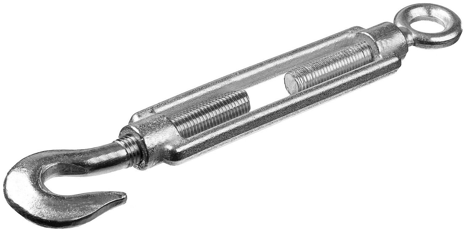 | Дополнительно | 1. Изготовлен из оцинкованной стали 2. Применяется для регулировки натяжения цепей и тросов 3. Состоит из кованой натяжной муфты и резьбовых стержней с крюком/кольцом |