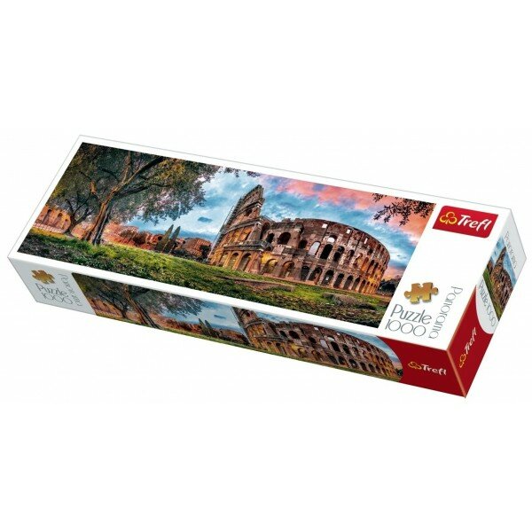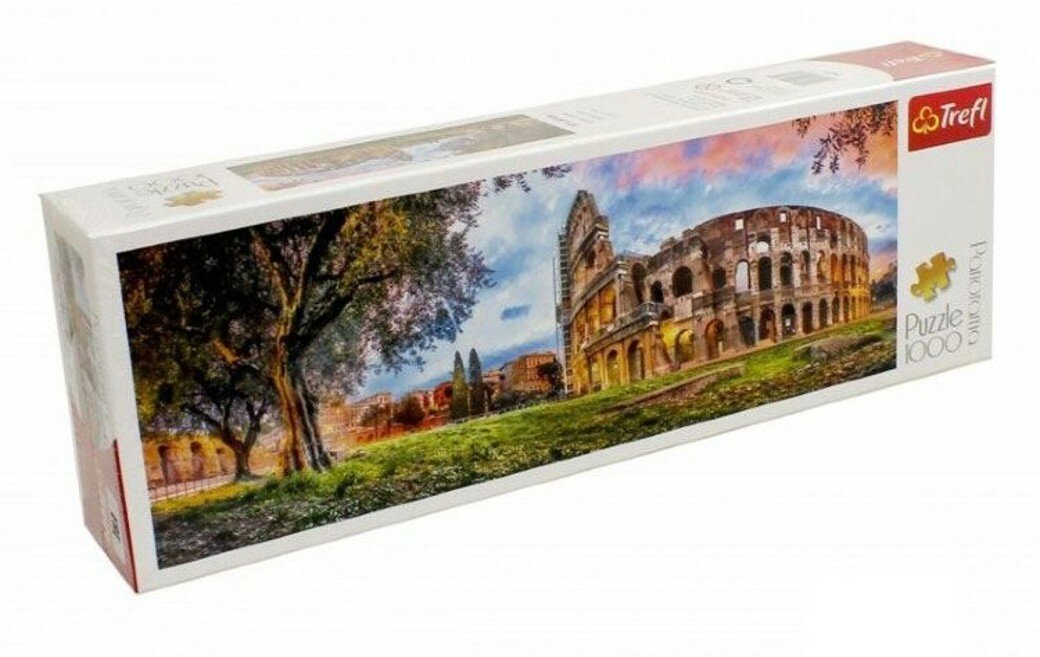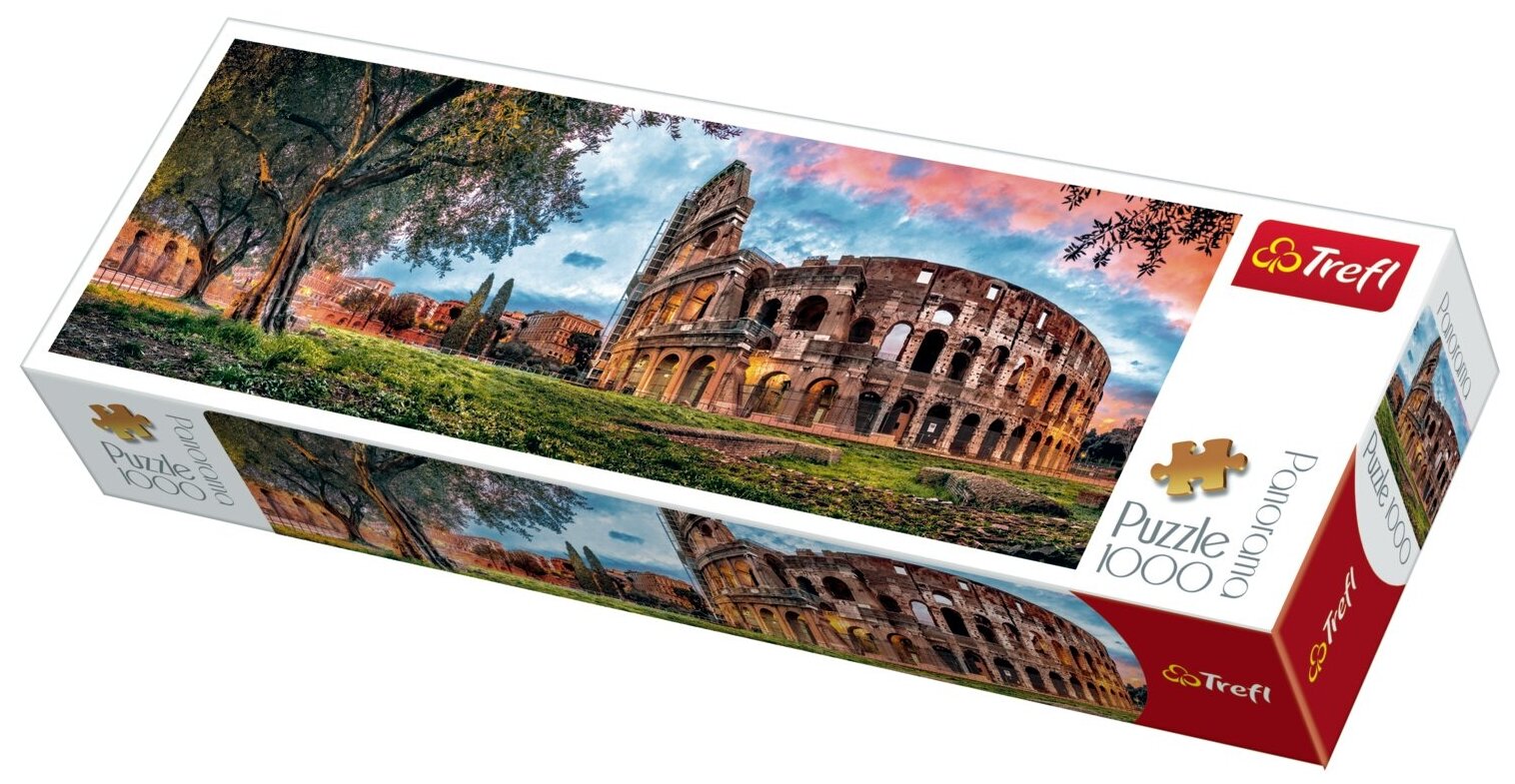 Польская компания Trefl представляет панорамный пазл Колизей утром, состоящий из 1000 деталей. В результате долгого, но приятного труда получится невероятно красивая картина прекрасного итальянского утра. На картине с левой стороны можно увидеть большое дерево, а с правой - знаменитый Колизей. Благодаря составлению картинки из мозаики у ребенка развивается внимательность и усидчивость.