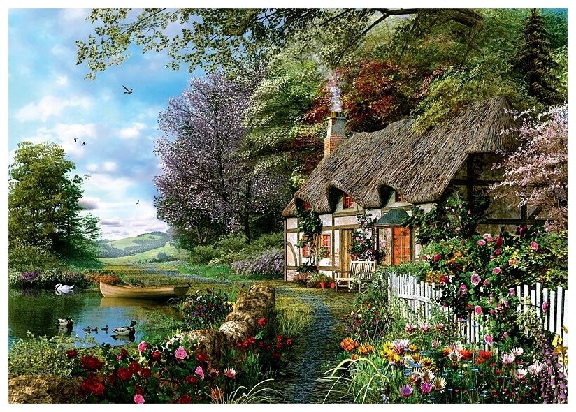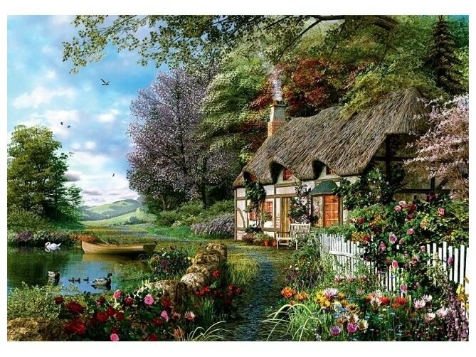 Райский уголок – чудесное место вдали от города, где стоит маленький аккуратный домик, разбит сад с прекрасными цветами, а в озере, расположенном прямо у коттеджа, плавают лебеди и утки. Загляните в эту красоту, собрав пазл «Райский уголок» от Trefl. Он предназначен для детей старше 12 лет и интересен не только ребенку, но и его родителям.