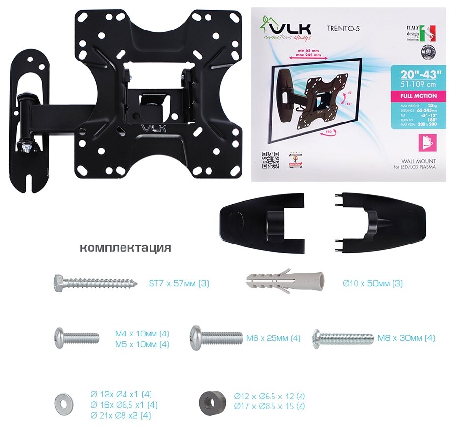 | Дополнительно | Кронштейн VLK Trento-5 изготовлен из высококачественной стали и способен выдерживать нагрузку до 25 кг. Конструкция кронштейна VLK Trento-5 способна наклонять ТВ на угол до 20°, а так же поворачивать на угол ±90°. Вы с лёгкостью можете установить любое удобное для просмотра положение экрана. Кронштейн легко установить на стену, благодаря съемной монтажной пластине. |