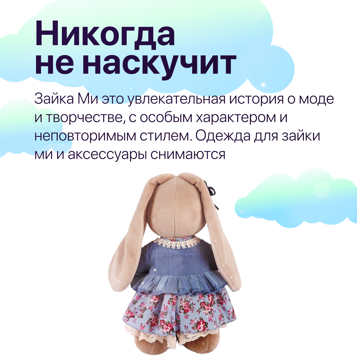 Милый и романтичный зайчик. Трогательный комплект в голубых тонах. Хлопковое платье нежно-голубого цвета с набивными цветами, отрезное по талии. Платье дополняет нижняя юбочка, отороченная тончайшим «венецианским» кружевом молочного цвета. Верх платья украшает бант, составленный из репсовой тесьмы цвета топлёного молока и атласной ленты василькового цвета. В комплекте – дымчато-голубой жакетик с двойной оборочкой по низу и хлопковым кружевом по вороту. На ушке у Зайки цветок с лентами из органзы и шёлка в сине-голубых оттенках. В лапках Зайка держит сумочку ручной работы из льна с цветочком и дизайнерской нашивкой.