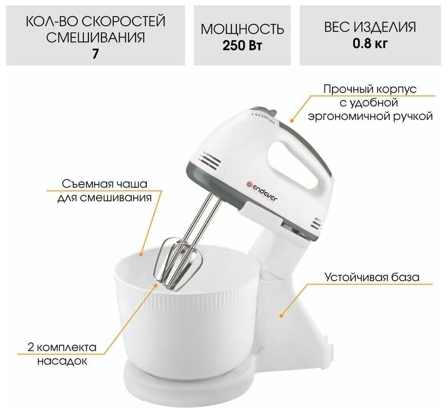 Многофункциональный миксер c чашей Endever - необходимый прибор для приготовления истинных кулинарных шедевров. В комплект поставки входят насадки для взбивания кремов, соусов и муссов, а также крюки для замешивания теста. Двигатель мощностью 250 Вт справится с небольшим объёмом продуктов, необходимым для приготовления повседневных и праздничных блюд. Миксер поставляется с устойчивой базой и пластиковой чашей для смешивания с непрозрачными стенками.