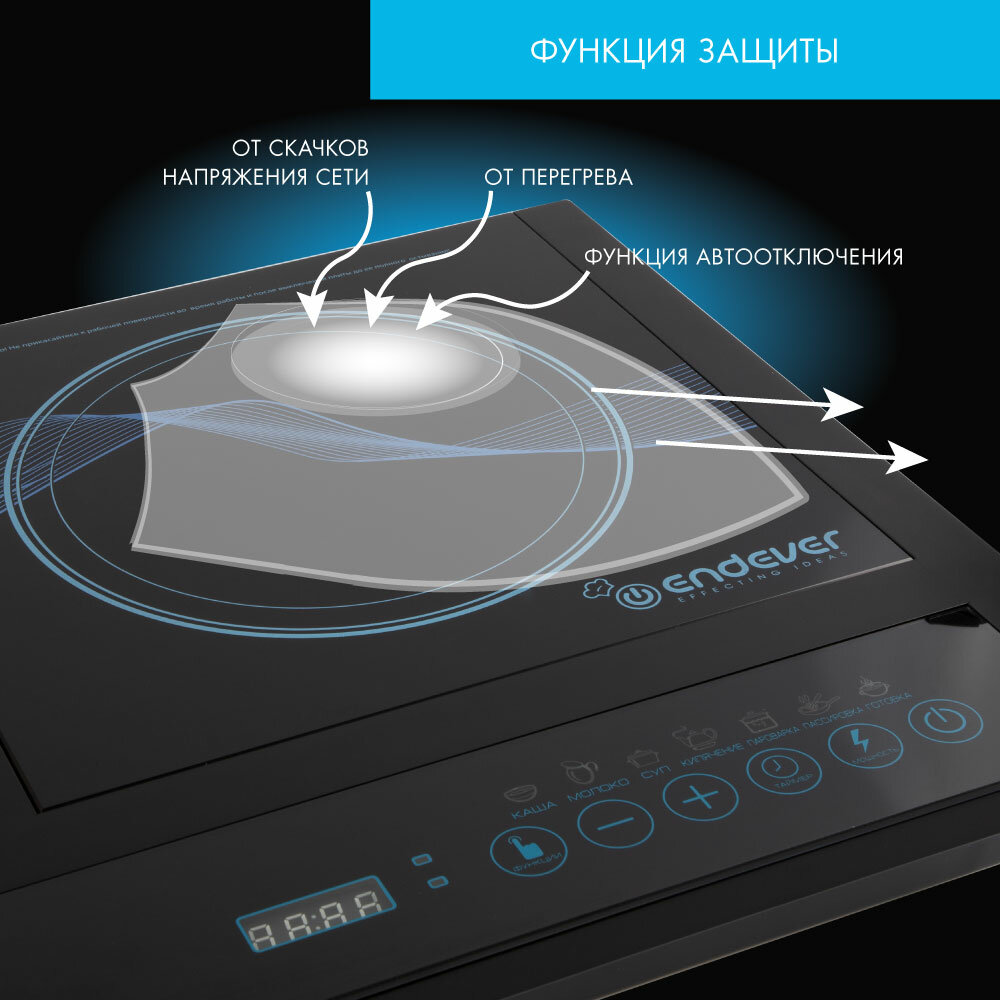 Компактная индукционная плитка, которая хорошо подойдет для использования в офисе или на даче. Современный дизайн делает данную модель идеальным украшением для любого интерьера. Endever оснащена двумя варочными панелями и индукционной конфоркой. Пользоваться устройством при этом очень легко и просто. В нижней части плитки расположен цифровой дисплей и сенсорные кнопки, с помощью которых можно выставить нужную температуру или же время работы.