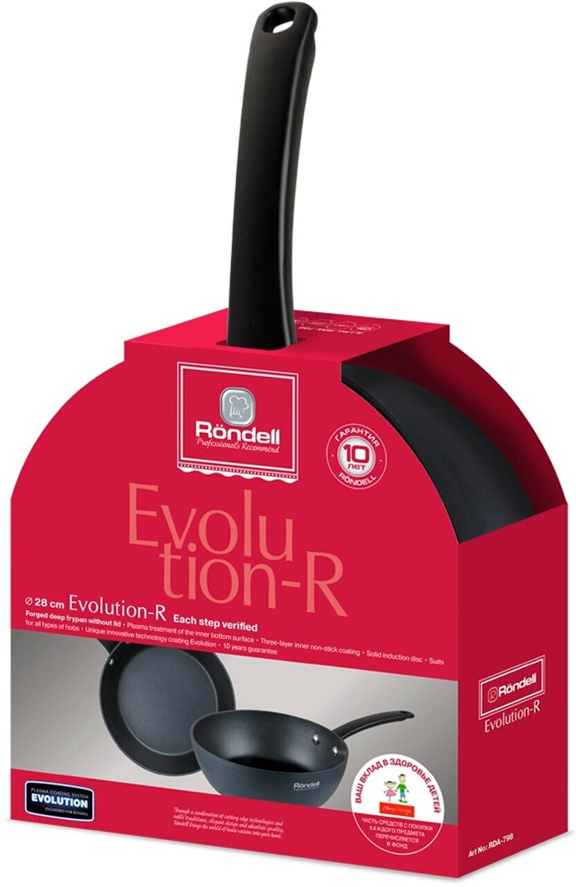 Rondell RDA-798 – вместительная сковорода с толстыми стенками из кованого алюминия, входящая в серию Evolution-R. Она совместима с конфорками различных типов, в том числе и с индукционными, и может использоваться в духовке.