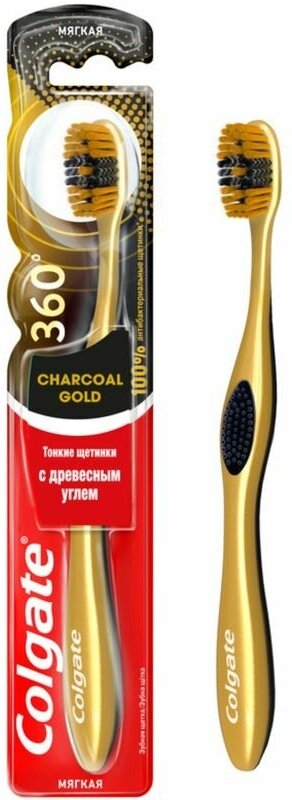 Зубная щетка Colgate 360 Золотая с древесным углем мягкая.Уникальные преимущества:Впервые 100% антибактериальные щетинки, предотвращающие размножение бактерий на зубной щетке на срок до 90 дней. Спиралевидные щетинки с древесным углем удаляют потемнения на эмали.Утонченные мягкие щетинки лучше удаляют налет между зубами и вдоль линии десен.Срок годности не ограничен.